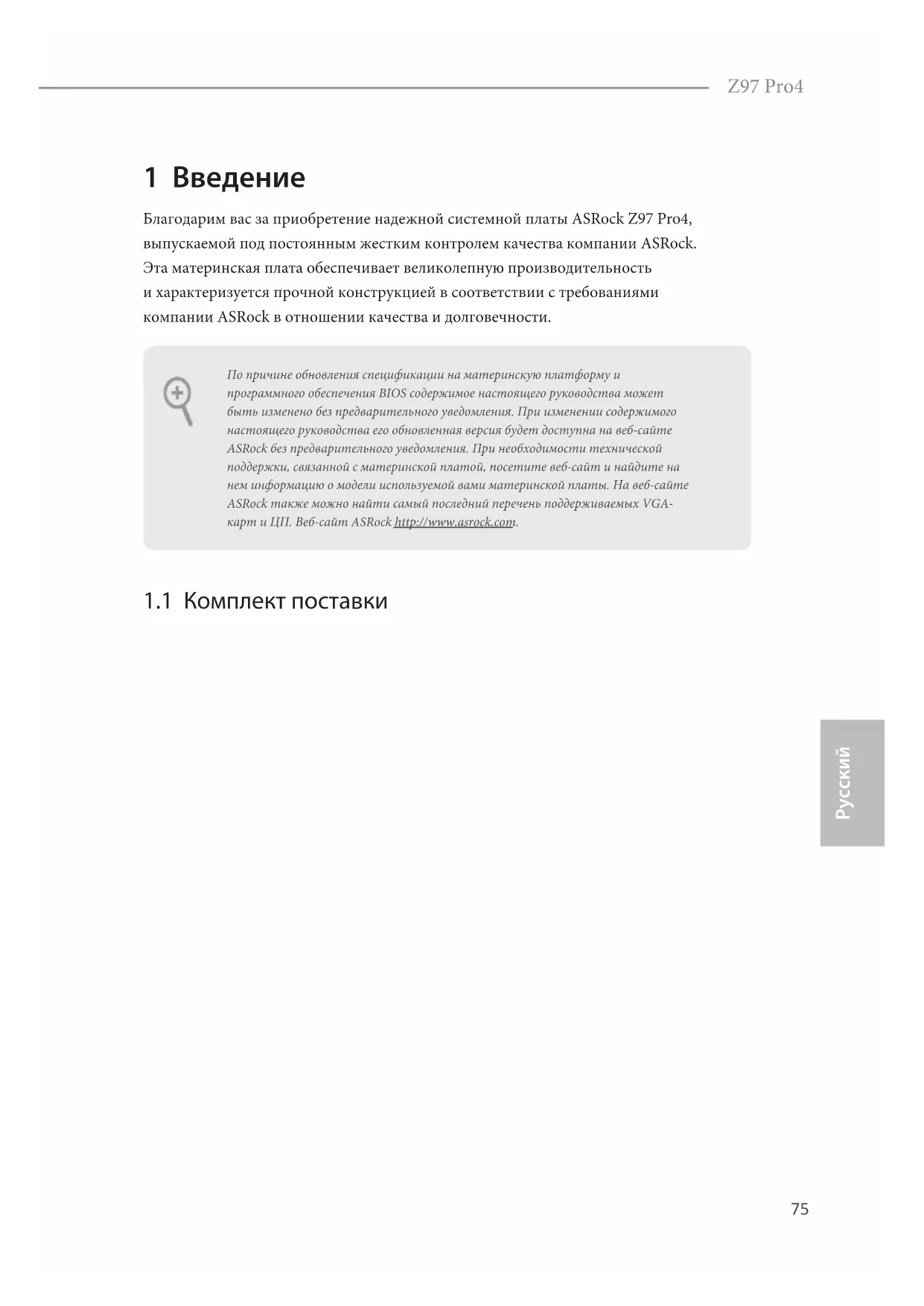 Z97 Pro4 1 Введение Благодарим вас за приобретение надежной системной платы ASRock Z97 Pro4, выпускаемой под постоянным жестким контролем качества компании ASRock. Эта материнская плата обеспечивает великолепную производительность и характеризуется прочной конструкцией в соответствии с требованиями компании ASRock в отношении качества и долговечности.