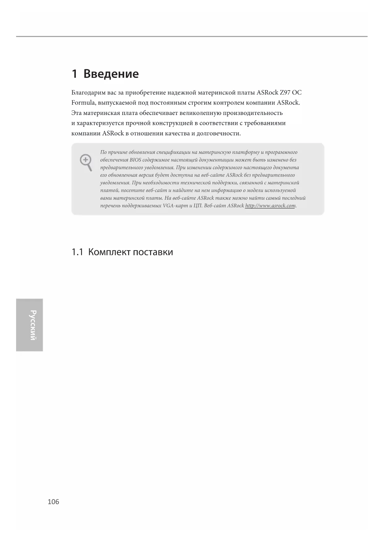 1 Введение Благодарим вас за приобретение надежной материнской платы ASRock Z97 OC Formula, выпускаемой под постоянным строгим контролем компании ASRock. Эта материнская плата обеспечивает великолепную производительность и характеризуется прочной конструкцией в соответствии с требованиями компании ASRock в отношении качества и долговечности.
