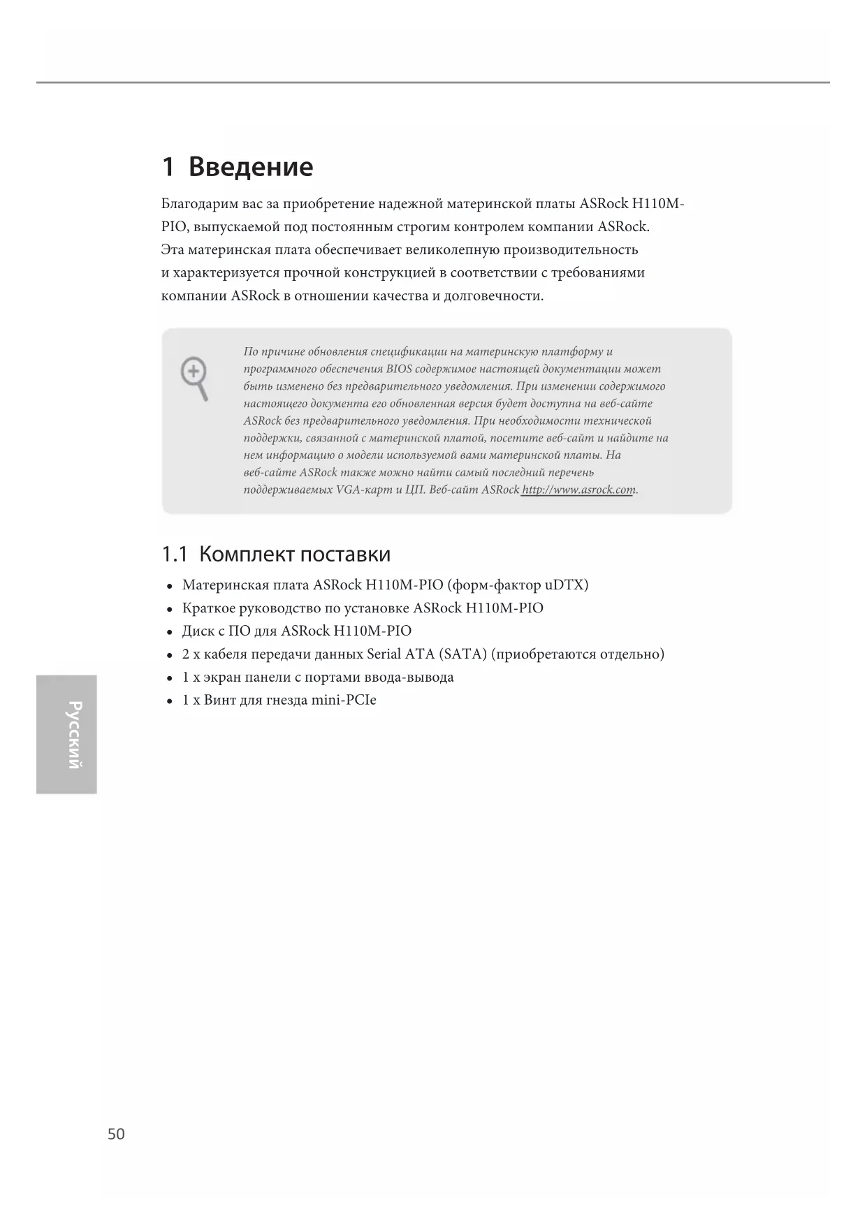 1 Введение Благодарим вас за приобретение надежной материнской платы ASRock H110M- PIO, выпускаемой под постоянным строгим контролем компании ASRock. Эта материнская плата обеспечивает великолепную производительность и характеризуется прочной конструкцией в соответствии с требованиями компании ASRock в отношении качества и долговечности.