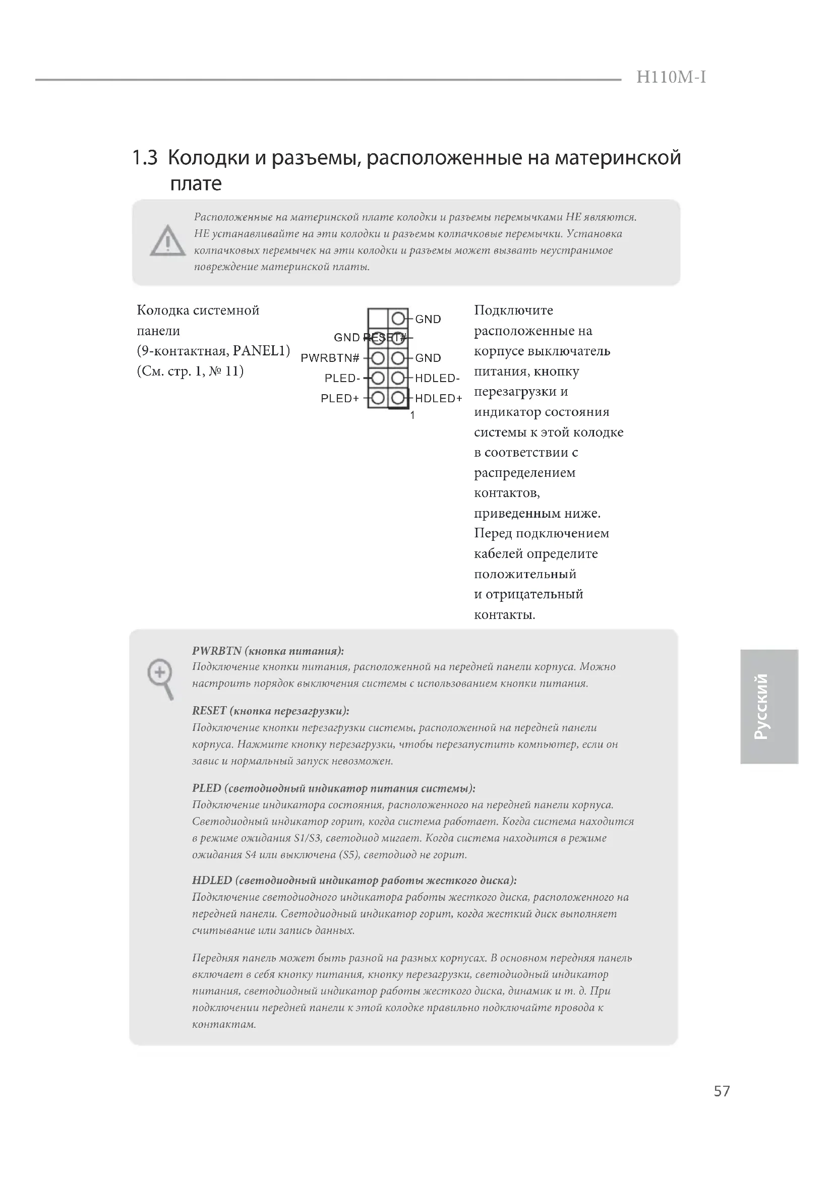 GND PWRBTN (кнопка питания): Подключение кнопки питания, расположенной на передней панели корпуса. Можно настроить порядок выключения системы с использованием кнопки питания. RESET (кнопка перезагрузки): Подключение кнопки перезагрузки системы, расположенной на передней панели корпуса. Нажмите кнопку перезагрузки, чтобы перезапустить компьютер, если он завис и нормальный запуск невозможен. PLED (светодиодный индикатор питания системы): Подключение индикатора состояния, расположенного на передней панели корпуса. Светодиодный индикатор горит, когда система работает. Когда система находится в режиме ожидания S1/S3, светодиод мигает. Когда система находится в режиме ожидания S4 или выключена (S5), светодиод не горит. HDLED (светодиодный индикатор работы жесткого диска): Подключение светодиодного индикатора работы жесткого диска, расположенного на передней панели. Светодиодный индикатор горит, когда жесткий диск выполняет считывание или запись данных. Передняя панель может быть разной на разных корпусах. В основном передняя панель включает в себя кнопку питания, кнопку перезагрузки, светодиодный индикатор питания, светодиодный индикатор работы жесткого диска, динамик и т. д. При подключении передней панели к этой колодке правильно подключайте провода к