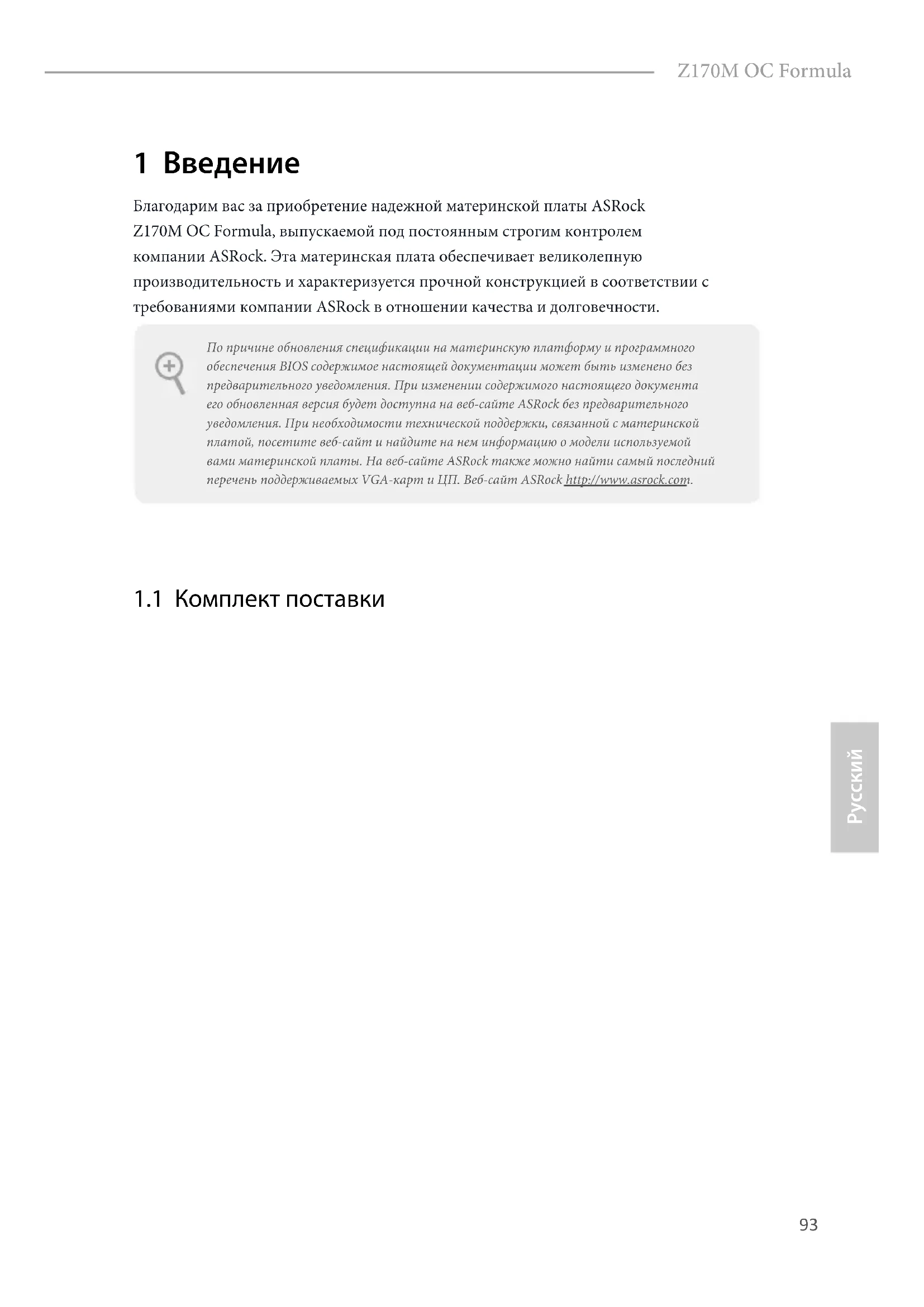 1 Введение Благодарим вас за приобретение надежной материнской платы ASRock Z170M OC Formula, выпускаемой под постоянным строгим контролем компании ASRock. Эта материнская плата обеспечивает великолепную производительность и характеризуется прочной конструкцией в соответствии с требованиями компании ASRock в отношении качества и долговечности.
