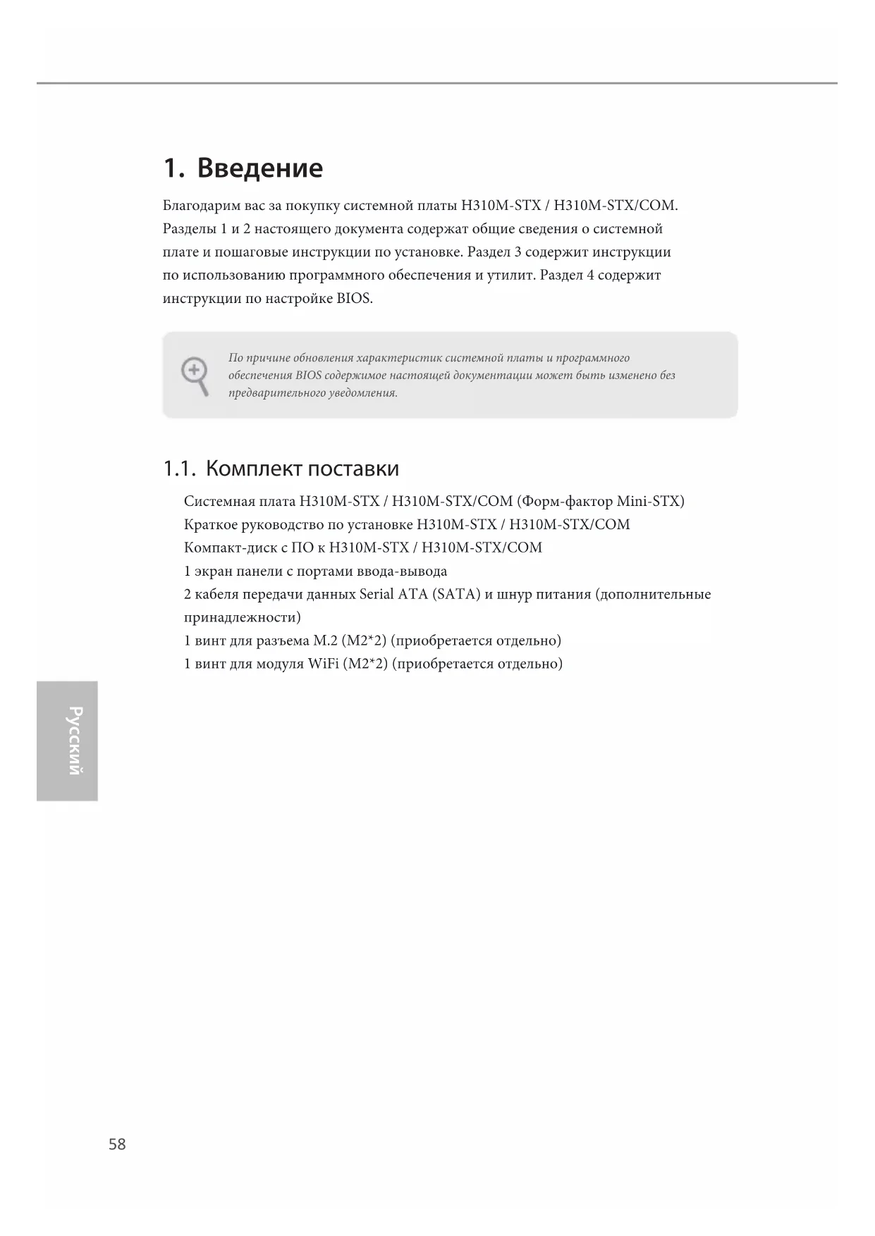 Благодарим вас за покупку системной платы H310M-STX / H310M-STX/COM. Разделы 1 и 2 настоящего документа содержат общие сведения о системной плате и пошаговые инструкции по установке. Раздел 3 содержит инструкции по использованию программного обеспечения и утилит. Раздел 4 содержит инструкции по настройке BIOS. 1.1. Комплект поставки