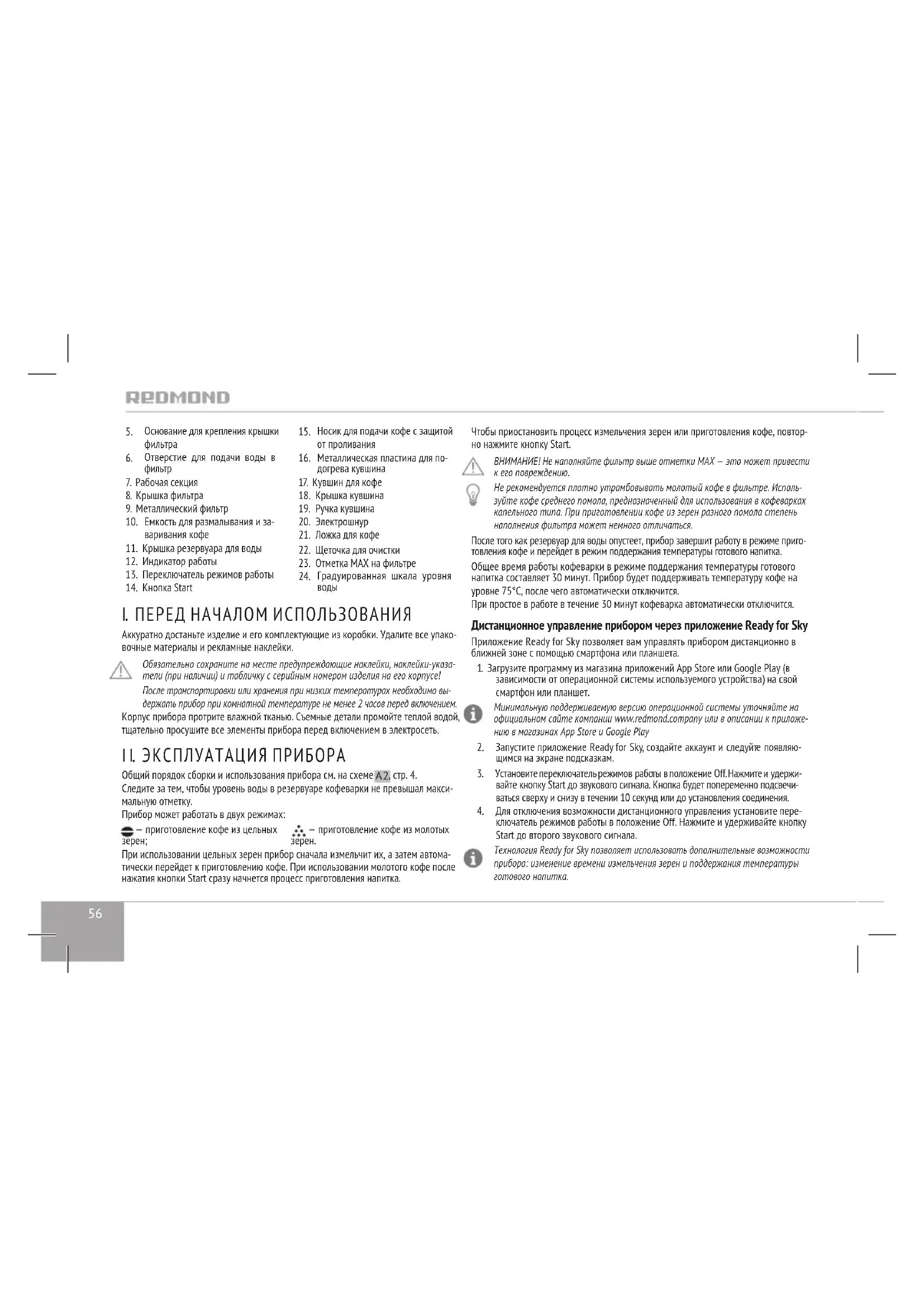 ВНИМАНИЕ! В случае возникновения какого-либо сбоя в работе приложения Ready for Sky, обращение в сервисный центр не обязательно. Обратитесь в службу технической поддержки REDMOND и получите консультацию наших специали- стов по устранению ошибки и/или сбоя в работе Ready for Sky. Ваши предложе- ния и замечания по работе приложения будут учтены при очередном обновлении. Контактные данные службы поддержки пользователей продукции REDMOND в вашей стране можно найти на сайте www.redmond.company. Вы также можете получить помощь, заполнив на данном сайте форму обратной связи. В случае если неисправность устранить не удалось, обратитесь в авторизо- ванный сервисный центр. Экологически безвредная утилизация (утилизация электрического и электронного оборудования) Утилизацию упаковки, руководства пользователя, а также самого прибо- ра необходимо производить в соответствии с местной программой по переработке отходов. Проявите заботу об окружающей среде: не выбра- сывайте такие изделия вместе с обычным бытовым мусором. Использованные (старые) приборы не должны выбрасываться с остальным бытовым мусором, они должны утилизироваться отдельно. Владельцы старого оборудования обязаны принести приборы в специальные пункты приема или сдать в соответству- ющие организации. Тем самым вы помогаете программе по переработке ценного сырья, а также очистке загрязняющих веществ. Данный прибор помечен в соответствии с Европейской директивой 2012/19/EU, регулирующей утилизацию электрического и электронного оборудования. Данная директива определяет основные требования к утилизации и переработке отходов от электрических и электронных приборов, действующие на всей террито- рии Европейского Союза. Bluetooth является зарегистрированным товарным знаком компании Bluetooth SIG, Inc. App Store является знаком обслуживания Apple Inc., зарегистрированным в США и других странах. Google Play является зарегистрированным товарным знаком компании Google Inc.SkyCoffee RCM-M1505S-E