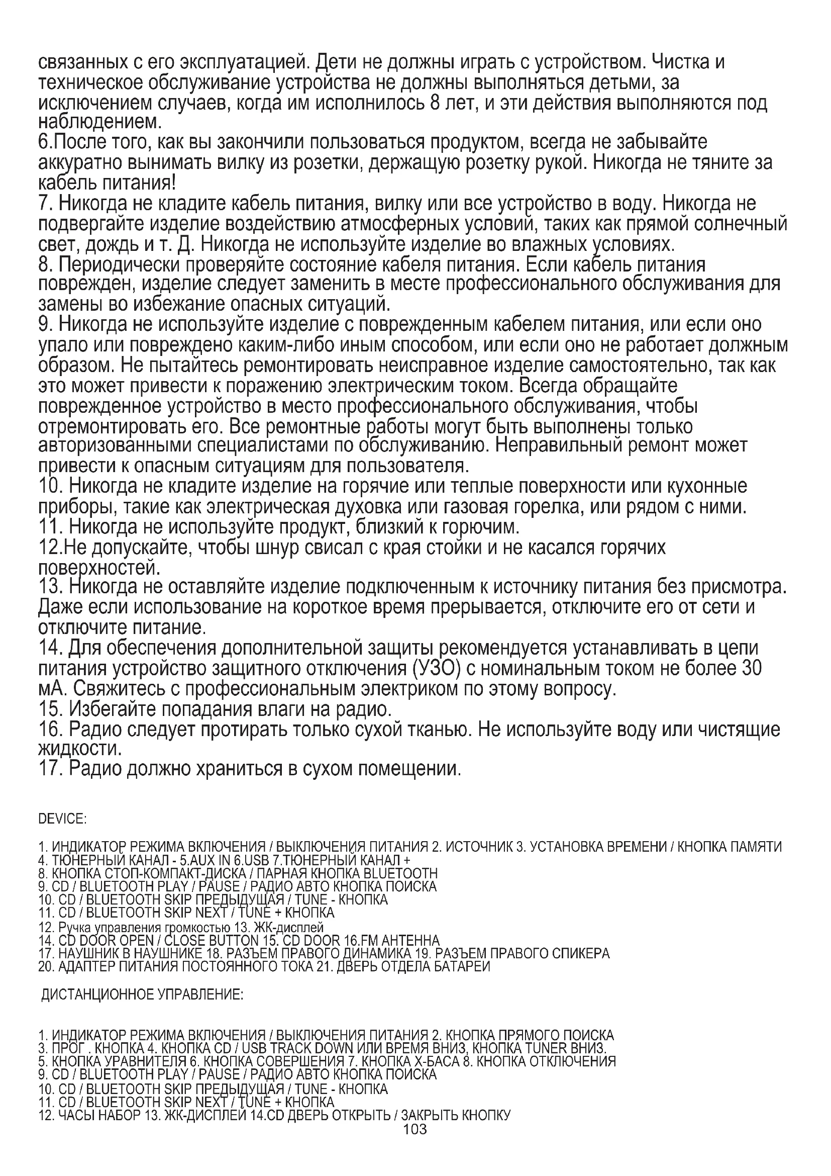 лет и лицами с ограниченными физическими, сенсорными или умственными способностями или лицами, не имеющими опыта или знаний об устройстве, только под наблюдением лица, ответственного за их безопасность, или если они были проинструктированы о безопасном использовании устройства и знают об опасностях,103 связанных с его эксплуатацией. Дети не должны играть с устройством. Чистка и техническое обслуживание устройства не должны выполняться детьми, за исключением случаев, когда им исполнилось 8 лет, и эти действия выполняются под наблюдением. 6.После того, как вы закончили пользоваться продуктом, всегда не забывайте аккуратно вынимать вилку из розетки, держащую розетку рукой. Никогда не тяните за кабель питания!