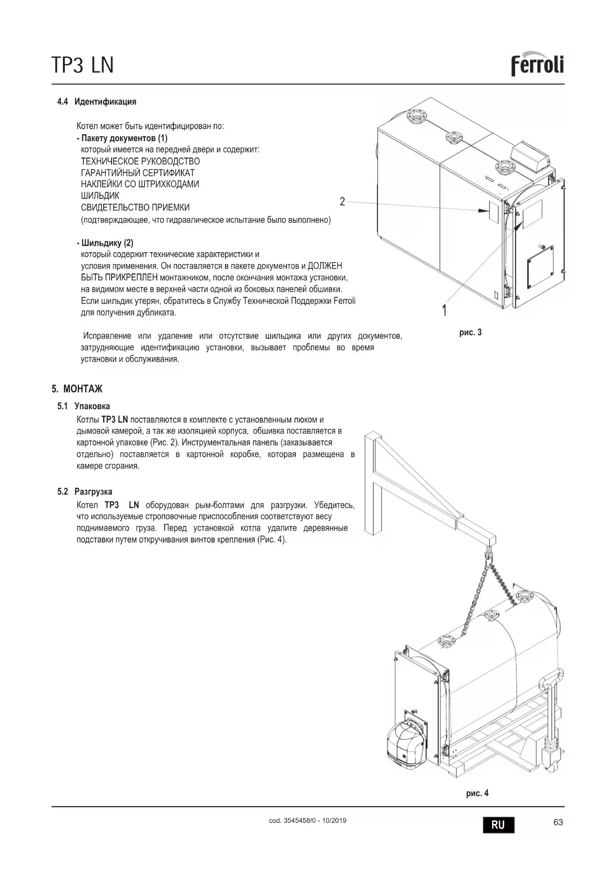Котел TP3 LN оборудован рым-болтами для разгрузки. Убедитесь, чтоиспользуемыестроповочныеприспособлениясоответствуютвесу поднимаемого груза. Перед установкой котла удалите деревянные подставкипутемоткручиваниявинтовкрепления(Рис.4). рис.3