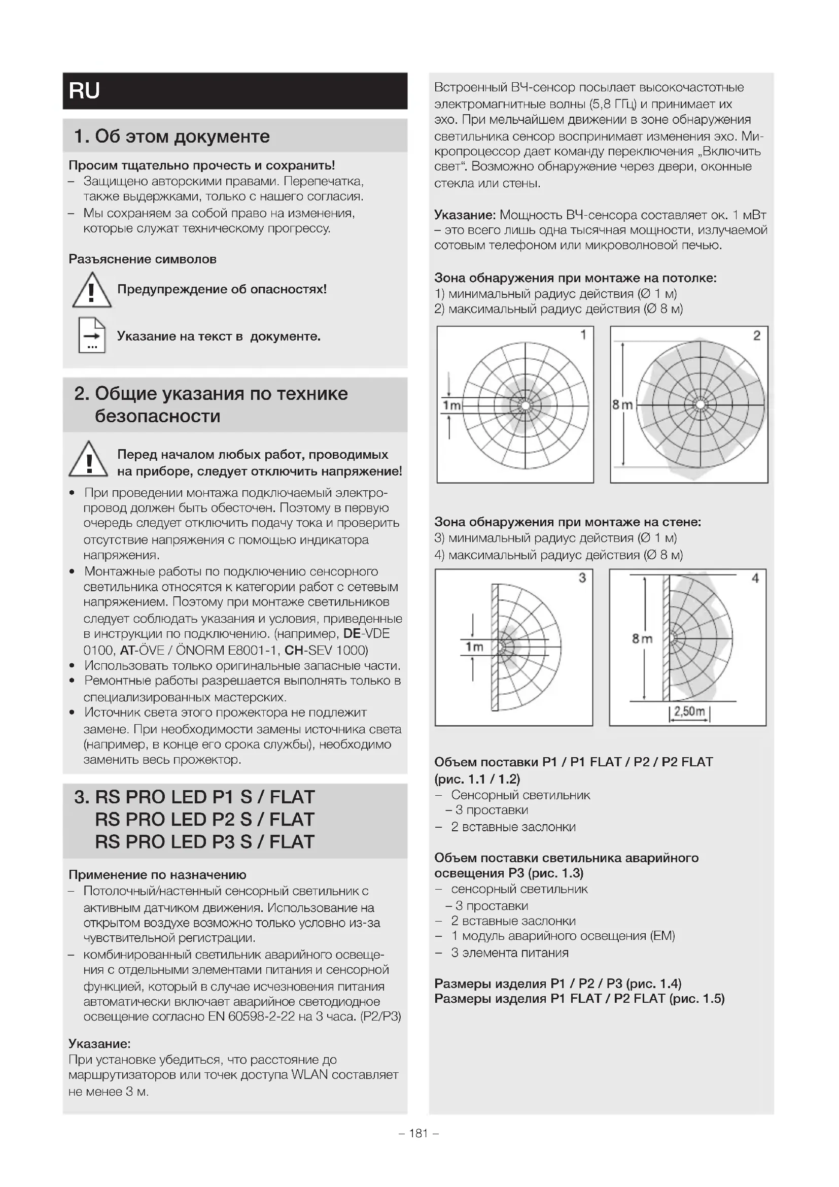 Применение по назначению – Потолочный/настенный сенсорный светильник с активным датчиком движения. Использование на открытом воздухе возможно только условно из-за чувствительной регистрации. – комбинированный светильник аварийного освеще- ния с отдельными элементами питания и сенсорной функцией, который в случае исчезновения питания автоматически включает аварийное светодиодное освещение согласно EN 60598-2-22 на 3 часа. (P2/P3)