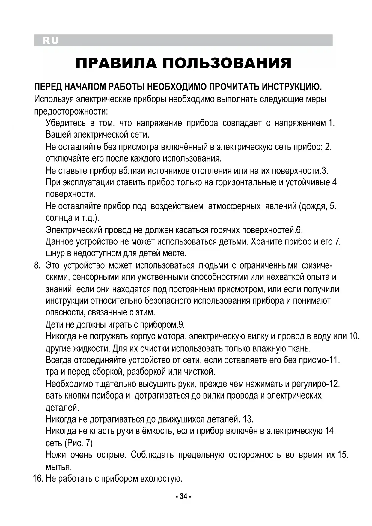 ПРАВИЛА ПОЛЬЗОВАНИЯ ПЕРЕД НАЧАЛОМ РАБОТЫ НЕОБХОДИМО ПРОЧИТАТЬ ИНСТРУКЦИЮ. Используя электрические приборы необходимо выполнять следующие меры предосторожности: Убедитесь в том, что напряжение прибора совпадает с напряжением 1. Вашей электрической сети. Не оставляйте без присмотра включённый в электрическую сеть прибор; 2. отключайте его после каждого использования. Не ставьте прибор вблизи источников отопления или на их поверхности.3. При эксплуатации ставить прибор только на горизонтальные и устойчивые 4. поверхности. Не оставляйте прибор под воздействием атмосферных явлений (дождя, 5. солнца и т.д.). Электрический провод не должен касаться горячих поверхностей.6. Данное устройство не может использоваться детьми. Храните прибор и его 7. шнур в недоступном для детей месте. Это устройство может использоваться людьми с ограниченными физиче-8. скими, сенсорными или умственными способностями или нехваткой опыта и знаний, если они находятся под постоянным присмотром, или если получили инструкции относительно безопасного использования прибора и понимают опасности, связанные с этим. Дети не должны играть с прибором.9. Никогда не погружать корпус мотора, электрическую вилку и провод в воду или 10. другие жидкости. Для их очистки использовать только влажную ткань. Всегда отсоединяйте устройство от сети, если оставляете его без присмо-11. тра и перед сборкой, разборкой или чисткой. Необходимо тщательно высушить руки, прежде чем нажимать и регулиро-12. вать кнопки прибора и дотрагиваться до вилки провода и электрических