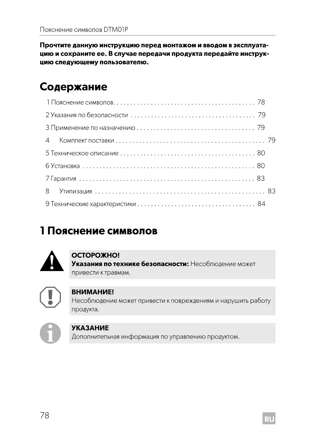 Дополнительная информация по управлению продуктом. DTM01P-M-16s.book Seite 78 Dienstag, 6. September 2016 5:51 17RU DTM01P Указания по безопасности