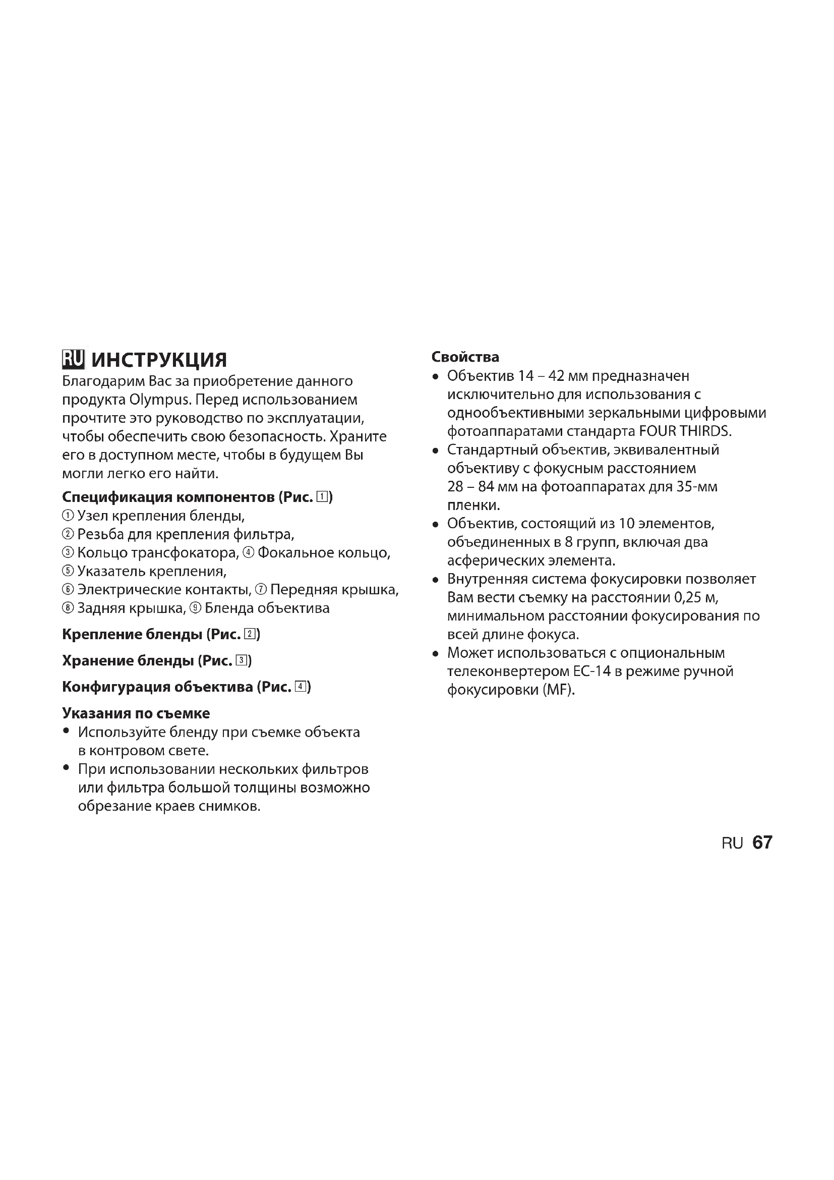 Благодарим Вас за приобретение данного продукта Olympus. Перед использованием прочтите это руководство по эксплуатации, чтобы обеспечить свою безопасность. Храните его в доступном месте, чтобы в будущем Вы могли легко его найти. Спецификация компонентов (Рис. 1) 1 Узел крепления бленды, 2 Резьба для крепления фильтра, 3 Кольцо трансфокатора, 4 Фокальное кольцо, 5 Указатель крепления, 6 Электрические контакты, 7 Передняя крышка, 8 Задняя крышка, 9 Бленда объектива Крепление бленды (Рис. 2) Хранение бленды (Рис. 3) Конфигурация объектива (Рис. 4) Указания по съемке Используйте бленду при съемке объекта в контровом свете. При использовании нескольких фильтров или фильтра большой толщины возможно обрезание краев снимков.