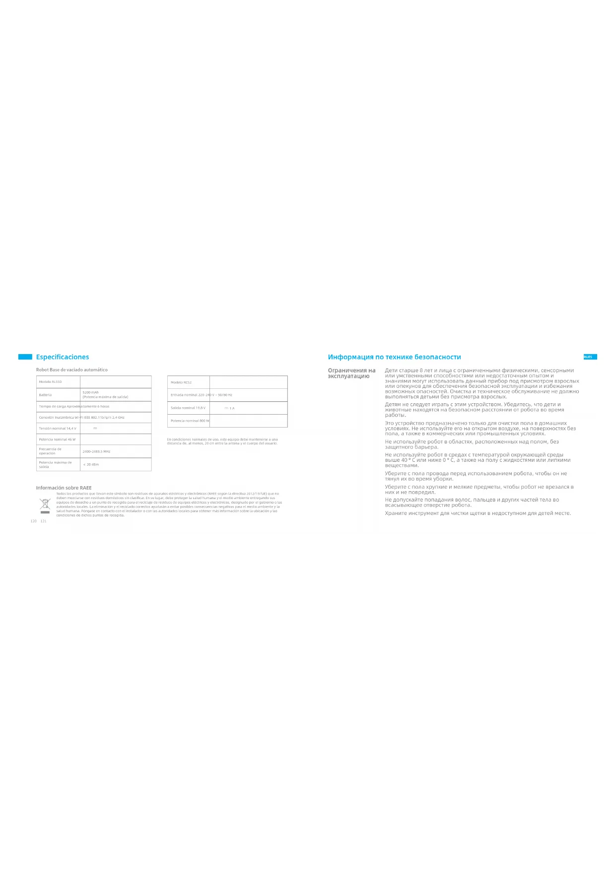 Это устройство предназначено только для очистки пола в домашних условиях. Не используйте его на открытом воздухе, на поверхностях без пола, а также в коммерческих или промышленных условиях. Не используйте робот в областях, расположенных над полом, без защитного барьера. Не используйте робот в средах с температурой окружающей среды выше 40 ° C или ниже 0 ° C, а также на полу с жидкостями или липкими веществами. Уберите с пола провода перед использованием робота, чтобы он не тянул их во время уборки. Уберите с пола хрупкие и мелкие предметы, чтобы робот не врезался в них и не повредил. Не допускайте попадания волос, пальцев и других частей тела во всасывающее отверстие робота. Храните инструмент для чистки щетки в недоступном для детей месте.122 123 RURU намоченным полотенцем или влажными руками. Не утилизируйте старые аккумуляторы ненадлежащим образом. Ненужные аккумуляторы следует сдавать в соответствующие пункты переработки. Если шнур питания поврежден или сломан, немедленно прекратите его использование и обратитесь в службу послепродажного обслуживания. Перед транспортировкой убедитесь, что робот выключен, и по возможности храните его в оригинальной упаковке. Если робот не будет использоваться в течение длительного периода, полностью зарядите его, отключите и храните в сухом прохладном месте. Во избежание чрезмерной разрядки аккумулятора заряжайте робот не реже одного раза в 3 месяца. Это устройство оснащено аккумуляторным блоком, который должны заменять только квалифицированные технические специалисты или специалисты отдела послепродажного обслуживания. Аккумулятор и