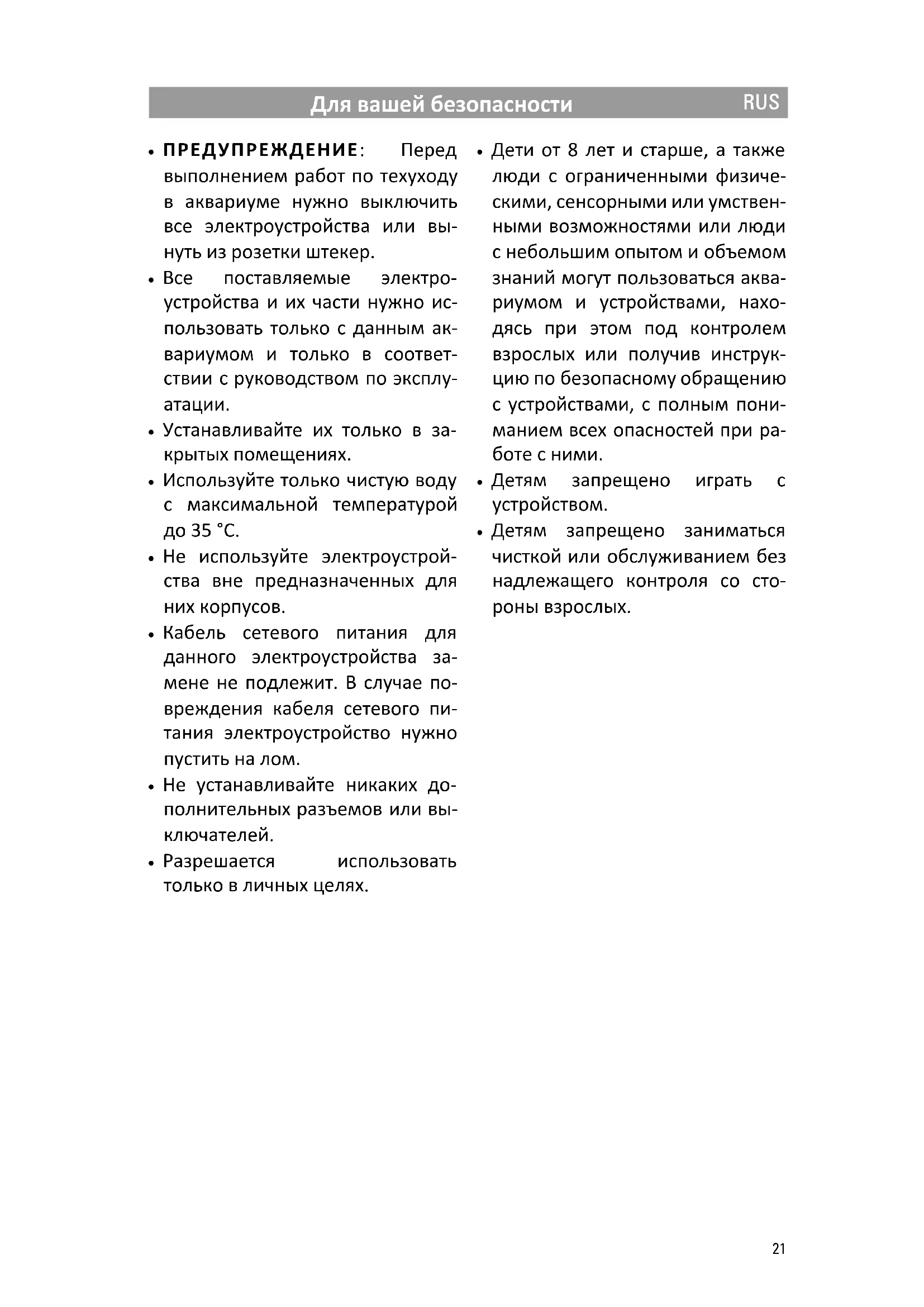 - ПРЕДУПРЕЖДЕНИЕ: Перед выполнением работ по техуходу в аквариуме нужно выключить все электроустройства или вы- нуть из розетки штекер.