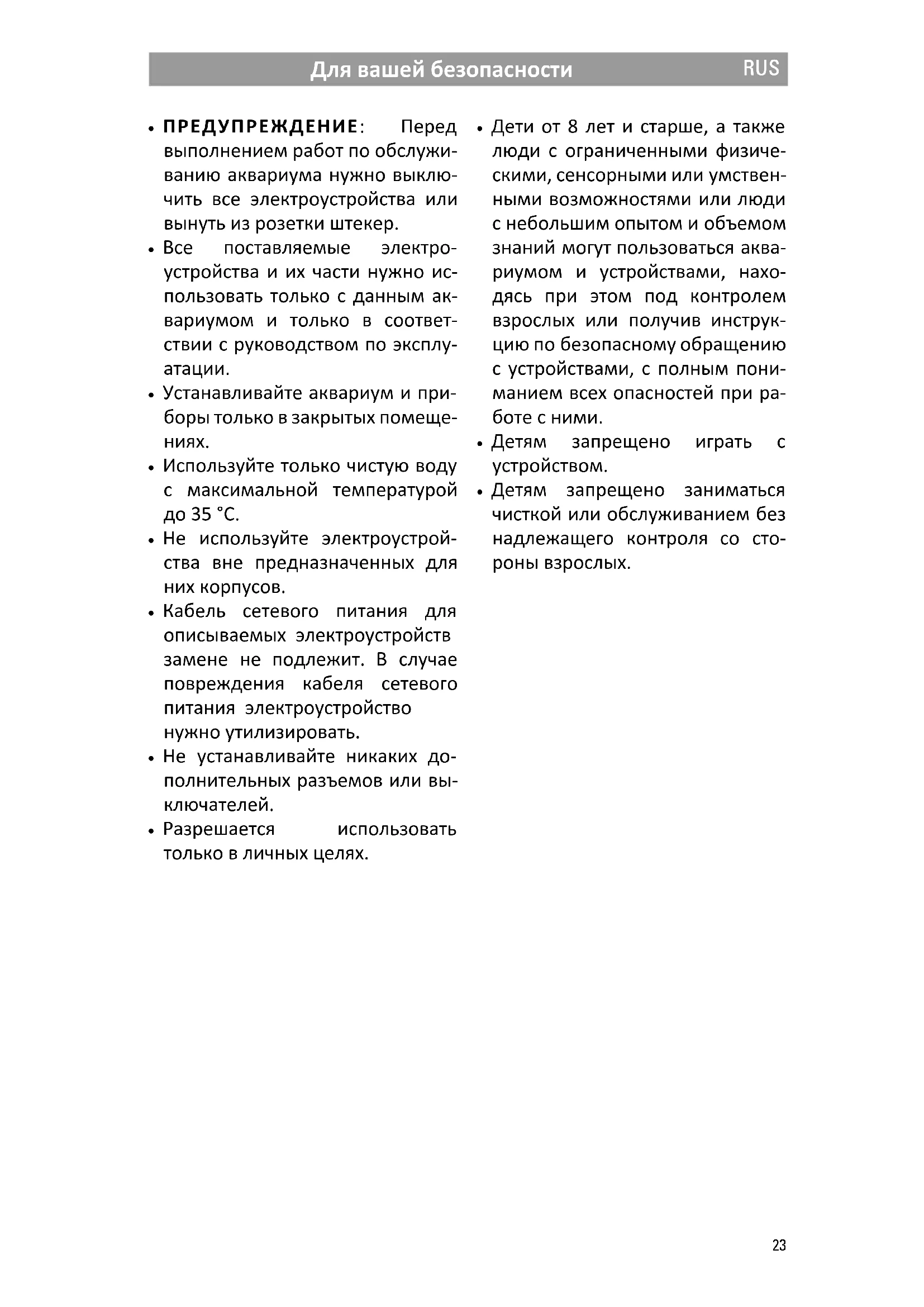 - Все поставляемые электро- устройства и их части нужно ис- пользовать только с данным ак- вариумом и только в соответ- ствии с руководством по эксплу-