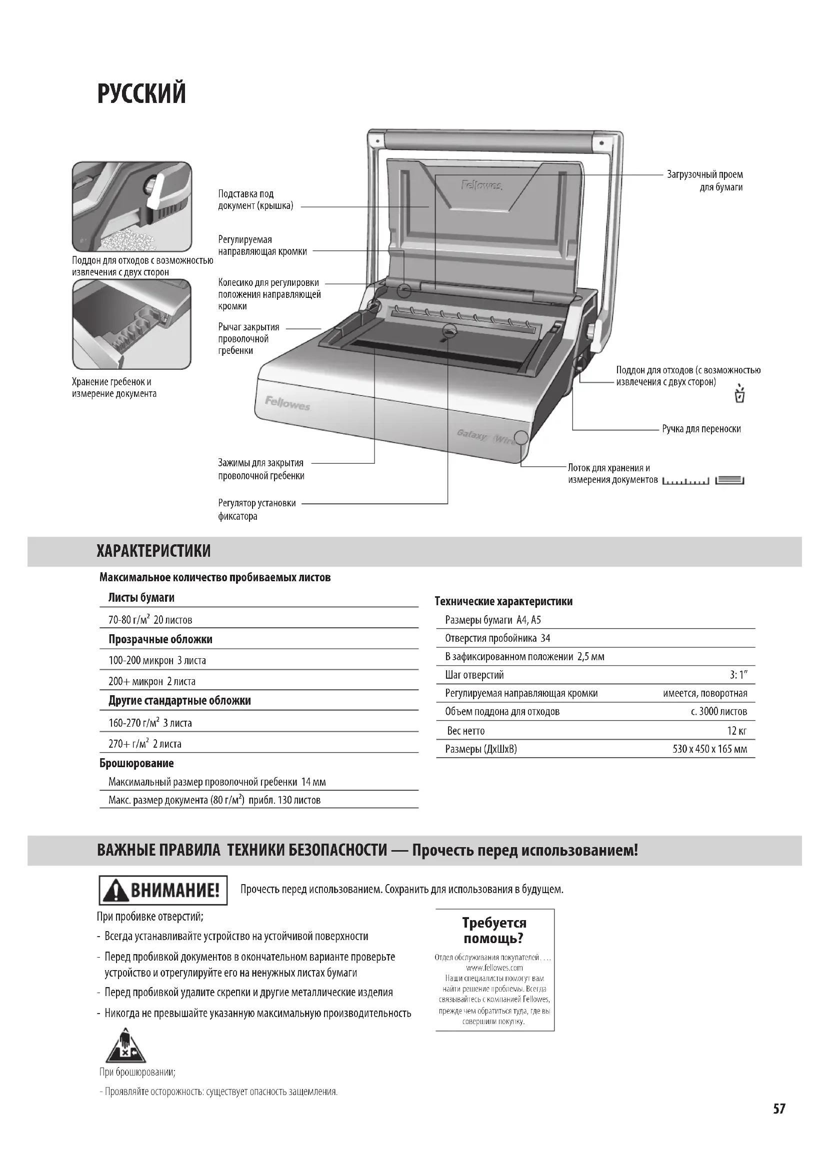 РУССКИЙИСПРАВЛЕНИЕ СБРОШЮРОВАННОГО ДОКУМЕНТА УДАЛЕНИЕ БУМАЖНЫХ ОТХОДОВ МЕЖДУНАРОДНАЯ ГАРАНТИЯ Компания Fellowes гарантирует отсутствие дефектов материалов или изготовления всех деталей брошюровщика на протяжении 2-х лет со дня приобретения первоначальным покупателем. Если в течение гарантийного срока будет обнаружен дефект какой-либо детали, вы имеете право только и исключительно на ремонт или замену дефектной детали по усмотрению и за счет компании Fellowes. Данная гарантия не действует в случае неправильной эксплуатации, несоблюдения правил пользования или ремонта неуполномоченными лицами. Настоящий документ ограничивает действие любой подразумеваемой гарантии, в том числе гарантии товарного состояния или пригодности для использования в определенных целях, указанным выше соответствующим гарантийным сроком. Компания Fellowes ни при каких обстоятельствах не несет ответственность за любой косвенный ущерб, связанный с данным изделием. Данная гарантия дает вам определенные юридические права. У вас могут иметься другие юридические права, отличающиеся от прав, указанных в этой гарантии. Срок и условия данной гарантии действительны по всему миру, кроме тех стран, где местное законодательство может налагать иные ограничения или условия. Для получения более подробной информации или обслуживания по данной гарантии обратитесь в компанию Fellowes или к продавцу данного изделия. УСТРАНЕНИЕ НЕПОЛАДОК Проволочное брошюрование является надежной системой брошюрования. Дополнительные листы могут быть добавлены только после раскрепления документа и его повторного брошюрования. Поддон для отходов расположен внизу устройства, а доступ к нему осуществляется с обеих сторон. Для достижения наилучших результатов регулярно очищайте поддон. Поддон следует освобождать от отходов через каждые 50 операций, чтобы предотвратить его засорение.