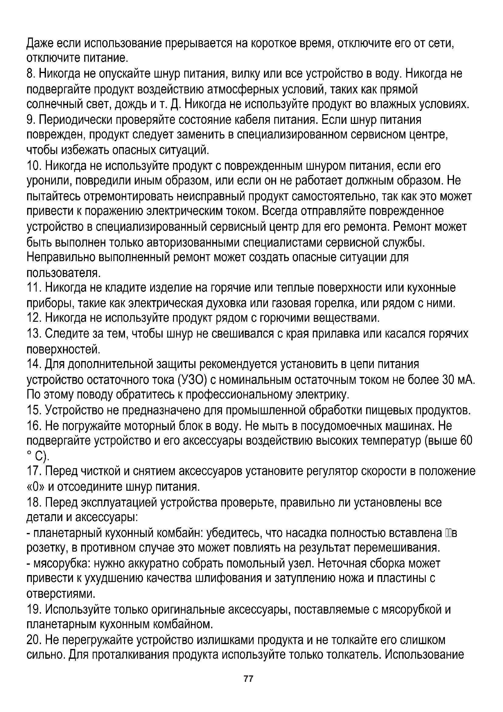 20. Не перегружайте устройство излишками продукта и не толкайте его слишком