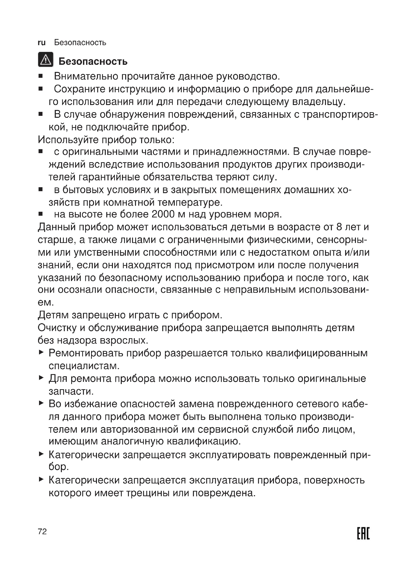 Безопасность ¡ Внимательно прочитайте данное руководство. ¡ Сохраните инструкцию и информацию о приборе для дальнейше- го использования или для передачи следующему владельцу. ¡ В случае обнаружения повреждений, связанных с транспортиров- кой, не подключайте прибор. Используйте прибор только: ¡ с оригинальными частями и принадлежностями. В случае повре- ждений вследствие использования продуктов других производи- телей гарантийные обязательства теряют силу. ¡ в бытовых условиях и в закрытых помещениях домашних хо- зяйств при комнатной температуре. ¡ на высоте не более 2000м над уровнем моря. Данный прибор может использоваться детьми в возрасте от 8 лет и старше, а также лицами с ограниченными физическими, сенсорны- ми или умственными способностями или с недостатком опыта и/или знаний, если они находятся под присмотром или после получения указаний по безопасному использованию прибора и после того, как они осознали опасности, связанные с неправильным использовани-
