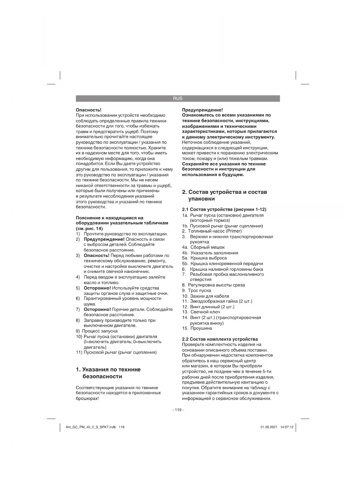 Предупреждение! В связи с угрозой причинения вреда жизни и здоровью пользователя нельзя использовать газонокосилку для производства следующих работ: для стрижки кустов, живой изгороди и клумб, для резки и измельчения вьющихся растений или травы на кровельных зеленых насаждениях или в балконных ящиках, для очистки (отсоса) пешеходных дорожек, а также в качестве измельчителя для измельчения обрезков деревьев и живой изгороди. Кроме того, нельзя использовать газонокосилку в качестве мотокультиватора для выравнивания возвышенностей (например, разрытой кротом земли). Исходя из соображений безопасности, нельзя использовать газонокосилку в качестве приводного агрегата для других рабочих инструментов и комплектов инструментов любого рода. Anl_GC_PM_40_2_S_SPK7.indb 120Anl_GC_PM_40_2_S_SPK7.indb 120 01.09.2021 14:07:1201.09.2021 14:07:12RUS
