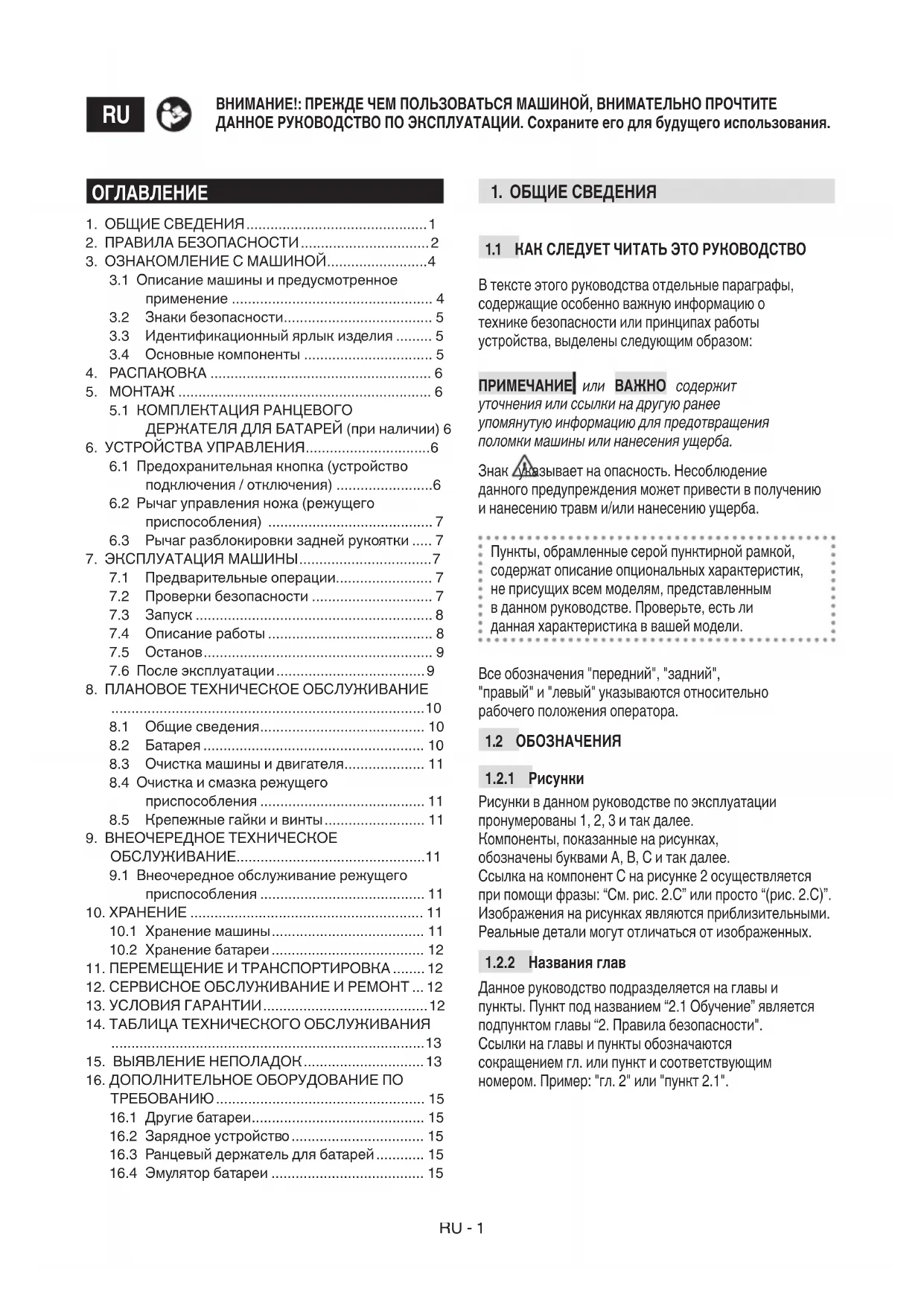 Данное руководство подразделяется на главы и пункты. Пункт под названием “2.1 Обучение” является подпунктом главы “2. Правила безопасности". Ссылки на главы и пункты обозначаются сокращением гл. или пункт и соответствующим номером. Пример: "гл. 2" или "пункт 2.1".