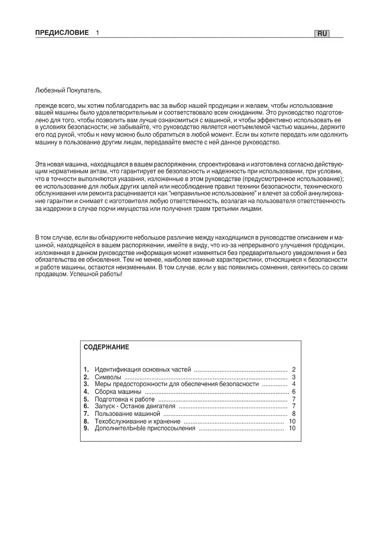 Cod Model T 1.0 EJ 118801750/0 (M8 x 1,25 dx M)RU ПРЕДИСЛОВИЕ 1 Любезный Покупатель, прежде всего, мы хотим поблагодарить вас за выбор нашей продукции и желаем, чтобы использование вашей машины было удовлетворительным и соответствовало всем ожиданиям. Это руководство подготов- лено для того, чтобы позволить вам лучше ознакомиться с машиной, и чтобы эффективно использовать ее в условиях безопасности; не забывайте, что руководство является неотъемлемой частью машины, держите его под рукой, чтобы к нему можно было обратиться в любой момент. Если вы хотите передать или одолжить машину в пользование другим лицам, передавайте вместе с ней данное руководство. Эта новая машина, находящаяся в вашем распоряжении, спроектирована и изготовлена согласно действую- щим нормативным актам, что гарантирует ее безопасность и надежность при использовании, при условии, что в точности выполняются указания, изложенные в этом руководстве (предусмотренное использование); ее использование для любых других целей или несоблюдение правил техники безопасности, технического обслуживания или ремонта расценивается как “неправильное использование” и влечет за собой аннулирова- ние гарантии и снимает с изготовителя любую ответственность, возлагая на пользователя ответственность за издержки в случае порчи имущества или получения травм третьими лицами. В том случае, если вы обнаружите небольшое различие между находящимся в руководстве описанием и ма- шиной, находящейся в вашем распоряжении, имейте в виду, что из-за непрерывного улучшения продукции, изложенная в данном руководстве информация может изменяться без предварительного уведомления и без обязательства ее обновления. Тем не менее, наиболее важные характеристики, относящиеся к безопасности и работе машины, остаются неизменными. В том случае, если у вас появились сомнения, свяжитесь со своим продавцом. Успешной работы!