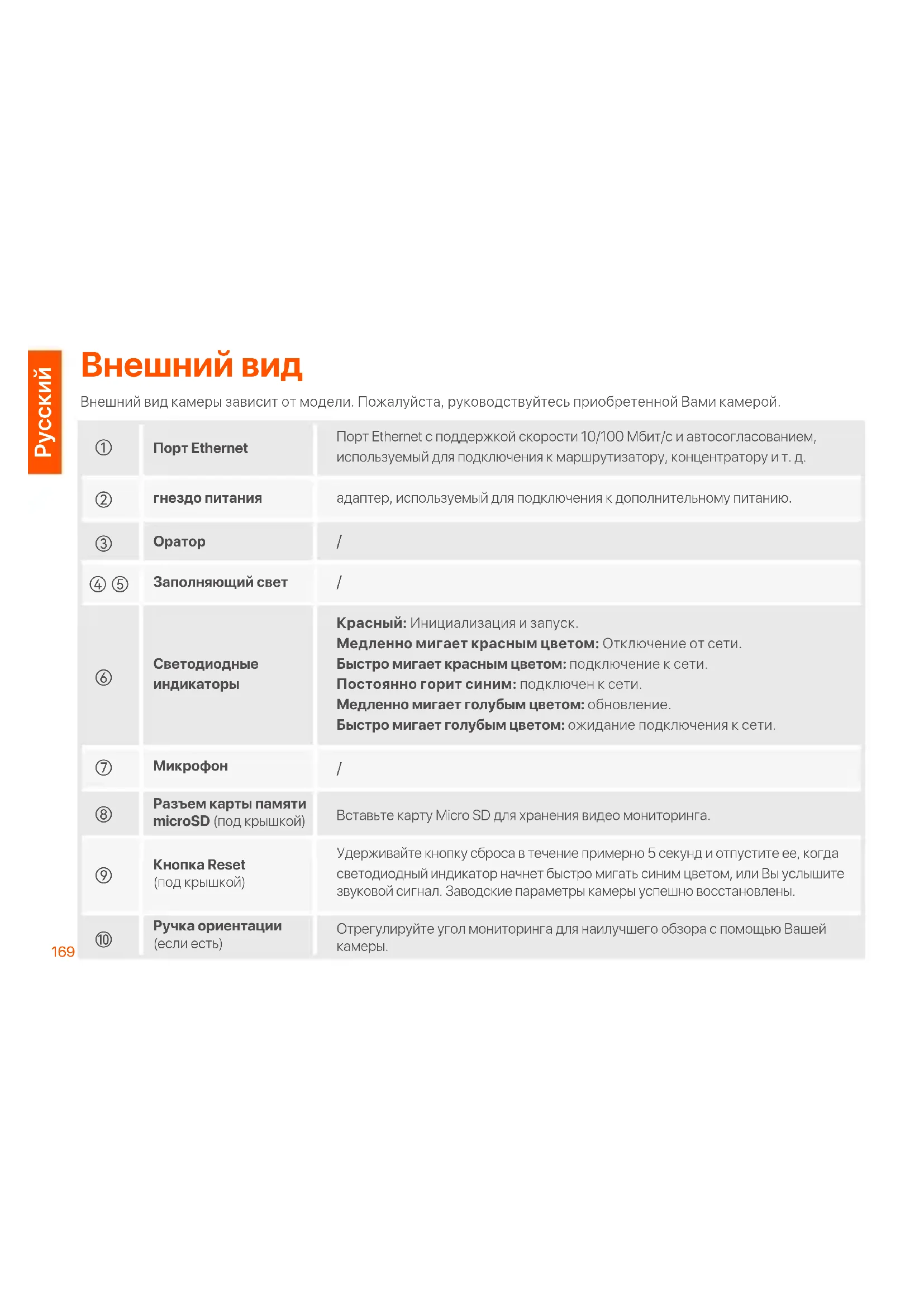 гнездо питания Порт Ethernet Кнопка Reset (под крышкой) Ручка ориентации (если есть) Разъем карты памяти microSD (под крышкой) Внешний вид Внешний вид камеры зависит от модели. Пожалуйста, руководствуйтесь приобретенной Вами камерой.170