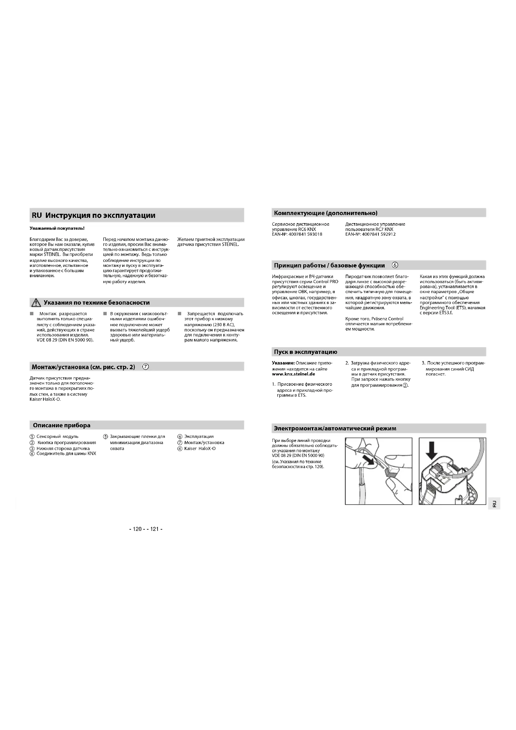Эксплуатация Монтаж/установка Kaiser HaloX-O Монтаж/установка (см. рис. стр. 2) Датчик присутствия предна- значен только для потолочно- го монтажа в перекрытиях по- лых стен, а также в систему Kaiser HaloX-O. RU Инструкция по эксплуатации Уважаемый покупатель! Благодарим Вас за доверие, которое Вы нам оказали, купив новый датчик присутствия марки STEINEL. Вы приобрели изделие высокого качества, изготовленное, испытанное и упакованное с большим