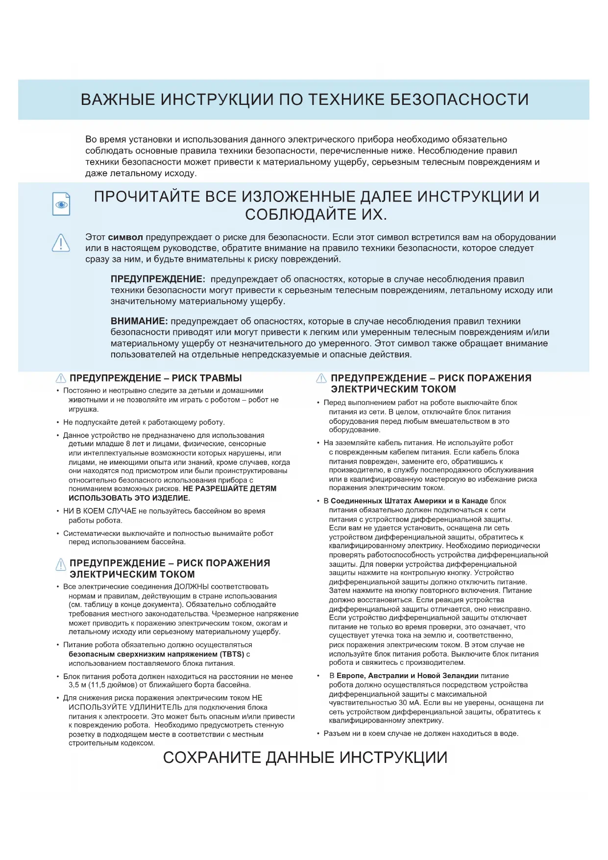 - Для снижения риска поражения электрическим током НЕ ИСПОЛЬЗУЙТЕ УДЛИНИТЕЛЬ для подключения блока питания к электросети. Это может быть опасным и/или привести к повреждению робота. Необходимо предусмотреть стенную розетку в подходящем месте в соответствии с местным строительным кодексом. Этот символ предупреждает о риске для безопасности. Если этот символ встретился вам на оборудовании или в настоящем руководстве, обратите внимание на правило техники безопасности, которое следует сразу за ним, и будьте внимательны к риску повреждений. ПРЕДУПРЕЖДЕНИЕ: предупреждает об опасностях, которые в случае несоблюдения правил техники безопасности могут привести к серьезным телесным повреждениям, летальному исходу или значительному материальному ущербу. ВНИМАНИЕ: предупреждает об опасностях, которые в случае несоблюдения правил техники безопасности приводят или могут привести к легким или умеренным телесным повреждениям и/или материальному ущербу от незначительного до умеренного. Этот символ также обращает внимание пользователей на отдельные непредсказуемые и опасные действия. ПРОЧИТАЙТЕ ВСЕ ИЗЛОЖЕННЫЕ ДАЛЕЕ ИНСТРУКЦИИ И СОБЛЮДАЙТЕ ИХ. ПРЕДУПРЕЖДЕНИЕ – РИСК ТРАВМЫ ПРЕДУПРЕЖДЕНИЕ – РИСК ПОРАЖЕНИЯ ЭЛЕКТРИЧЕСКИМ ТОКОМ ПРЕДУПРЕЖДЕНИЕ – РИСК ПОРАЖЕНИЯ ЭЛЕКТРИЧЕСКИМ ТОКОМ
