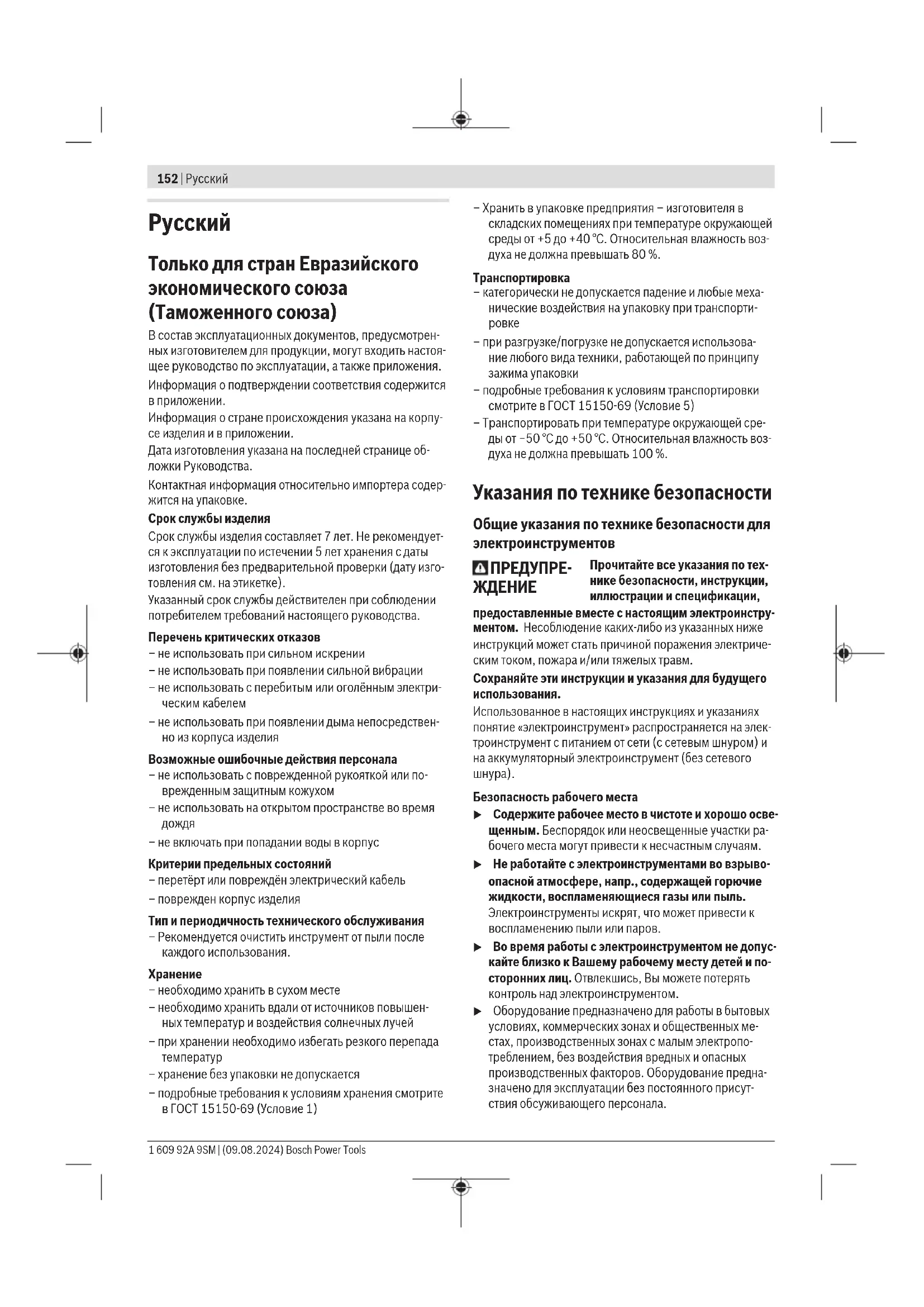 Безопасность рабочего места u Содержите рабочее место в чистоте и хорошо осве- щенным. Беспорядок или неосвещенные участки ра- бочего места могут привести к несчастным случаям. u Не работайте с электроинструментами во взрыво- опасной атмосфере, напр., содержащей горючие жидкости, воспламеняющиеся газы или пыль. Электроинструменты искрят, что может привести к воспламенению пыли или паров. u Во время работы с электроинструментом не допус- кайте близко к Вашему рабочему месту детей и по- сторонних лиц. Отвлекшись, Вы можете потерять контроль над электроинструментом. u Оборудование предназначено для работы в бытовых условиях, коммерческих зонах и общественных ме- стах, производственных зонах с малым электропо- треблением, без воздействия вредных и опасных производственных факторов. Оборудование предна- значено для эксплуатации без постоянного присут- ствия обсуживающего персонала. 1 609 92A 9SM | (09.08.2024) Bosch Power ToolsРусский | 153 Электробезопасность u Штепсельная вилка электроинструмента должна подходить к штепсельной розетке. Ни в коем слу- чае не вносите изменения в штепсельную вилку. Не применяйте переходные штекеры для элек- троинструментов с защитным заземлением. Неиз- мененные штепсельные вилки и подходящие штепсельные розетки снижают риск поражения элек-