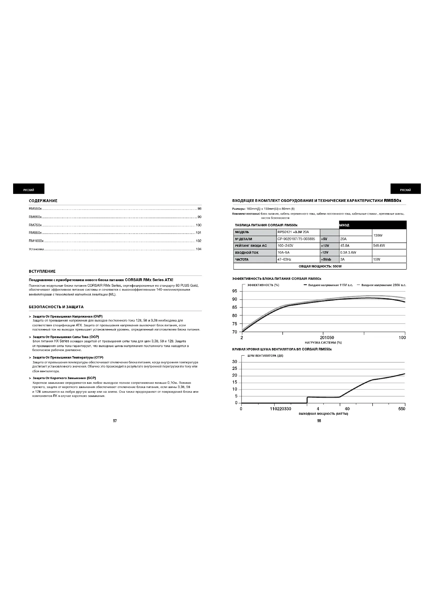 - Установка Поздравляем с приобретением нового блока питания CORSAIR RMx Series ATX! Полностью модульные блоки питания CORSAIR RMx Series, сертифицированные по стандарту 80 PLUS Gold, обеспечивают эффективное питание системы и сочетаются с высокоэффективными 140-миллиметровыми вентиляторами с технологией магнитной левитации (ML). > Защита От Превышения Напряжения (OVP) Защита от превышения напряжения для выходов постоянного тока 12В, 5В и 3,3В необходима для соответствия спецификации ATX. Защита от превышения напряжения выключает блок питания, если постоянный ток на выходах превышает установленный уровень, определенный изготовителем блока питания. > Защита От Превышения Силы Тока (OCP) Блок питания HX Series оснащен защитой от превышения силы тока для шин 3,3В, 5В и 12В. Защита от превышения силы тока гарантирует, что выходные шины напряжения постоянного тока находятся в безопасном рабочем диапазоне. > Защита От Превышения Температуры (OTP) Защита от превышения температуры обеспечивает отключение блока питания, когда внутренняя температура достигает установленного значения. Обычно это происходит в результате внутренней перегрузки по току или сбоя вентилятора. > Защита От Короткого Замыкания (SCP) Короткое замыкание определяется как любое выходное полное сопротивление меньше 0,1Ом. Помимо прочего, защита от короткого замыкания обеспечивает отключение блока питания, если шины 3,3В, 5В и 12В замыкаются на любую другую шину или на землю. Она также предохраняет от повреждений блока или компонентов ПК в случае короткого замыкания. p. 104