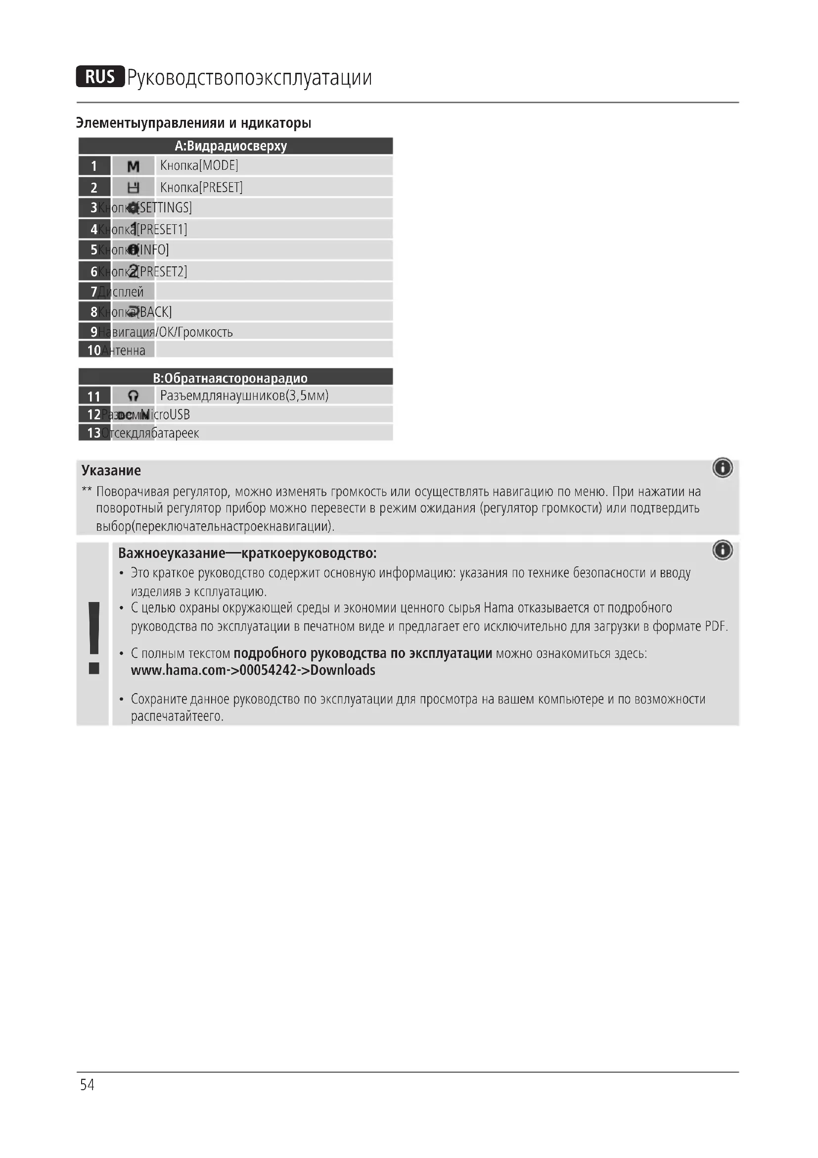 - Сполным текстом подробного руководства по эксплуатации можно ознакомиться здесь: www.hama.com -> 00054242 -> Downloads