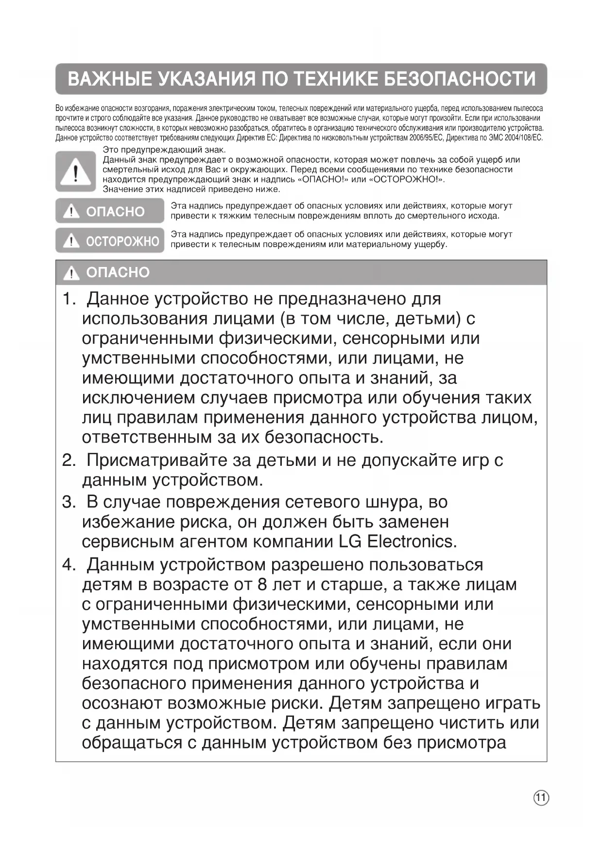 - Пылесос не предназначен для использования маленькими детьми и пожилыми людьми, находящимися без присмотра. Несоблюдение этого условия может привести к травме или повреждению изделия.