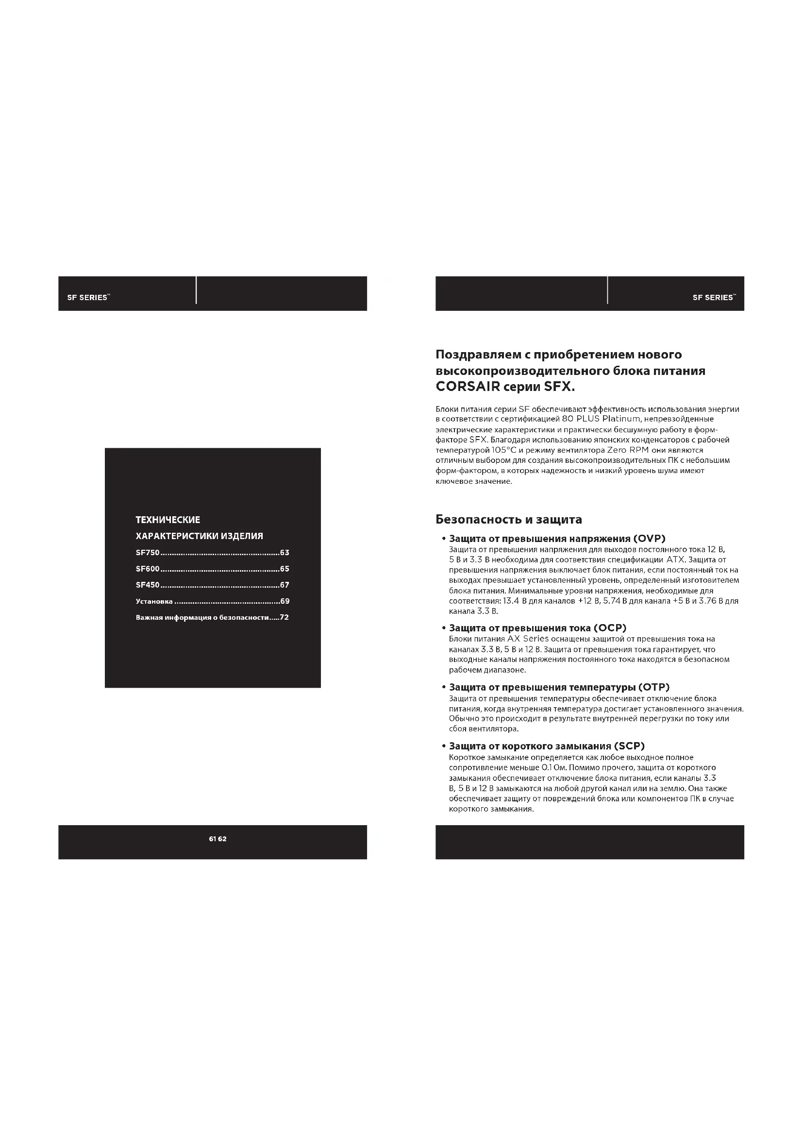 - Важная информация о безопасности Поздравляем с приобретением нового высокопроизводительного блока питания CORSAIR серии SFX. Блоки питания серии SF обеспечивают эффективность использования энергии в соответствии с сертификацией 80 PLUS Platinum, непревзойденные электрические характеристики и практически бесшумную работу в форм- факторе SFX. Благодаря использованию японских конденсаторов с рабочей температурой 105°C и режиму вентилятора Zero RPM они являются отличным выбором для создания высокопроизводительных ПК с небольшим форм-фактором, в которых надежность и низкий уровень шума имеют ключевое значение. Безопасность и защита p. 72