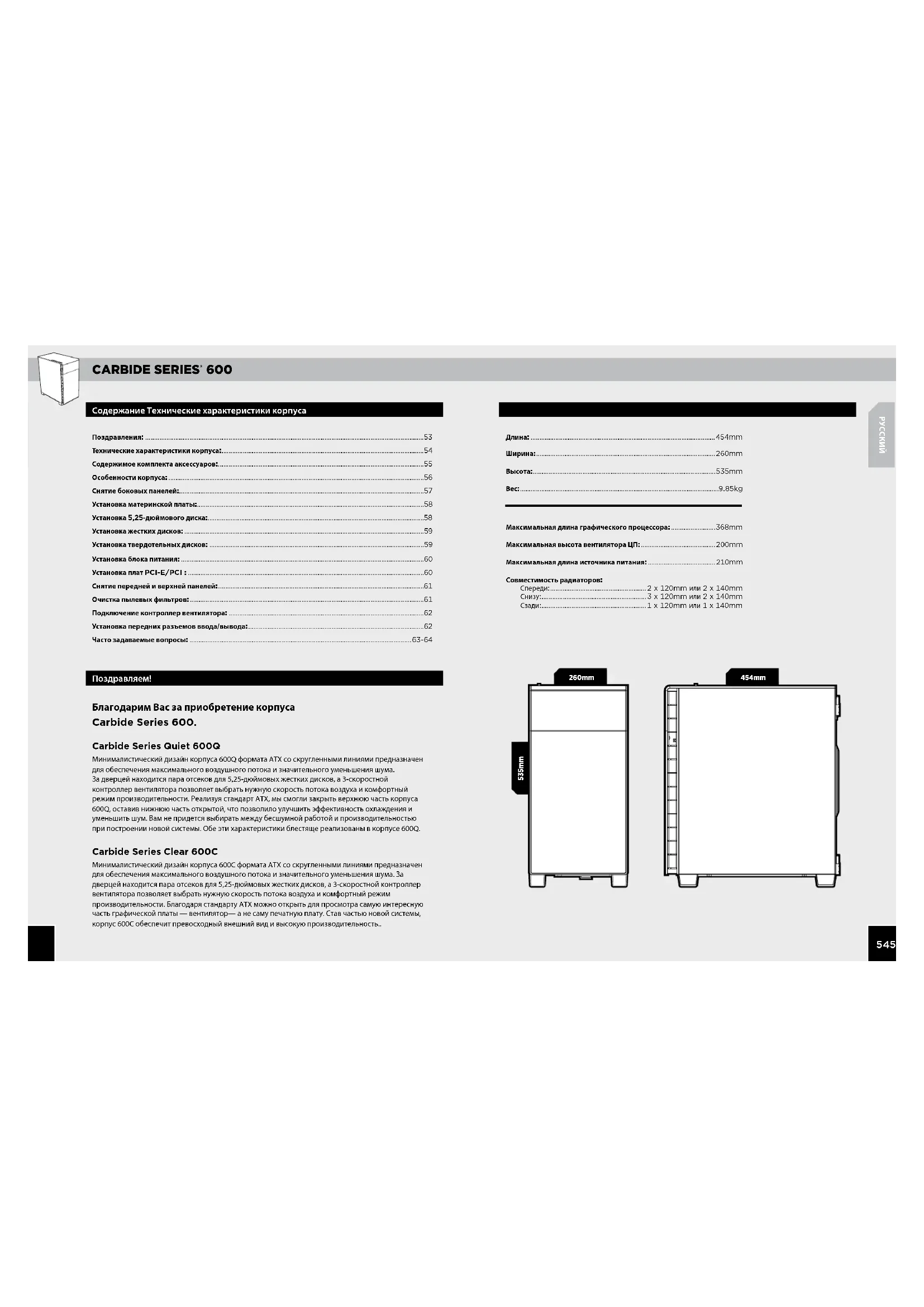 Содержание Технические характеристики корпуса Поздравляем! Поздравления: ............................................................................................................................................................. Технические характеристики корпуса: .................................................................................................................. Содержимое комплекта аксессуаров: .................................................................................................................... Особенности корпуса: ................................................................................................................................................ Снятие боковых панелей: .......................................................................................................................................... Установка материнской платы: ................................................................................................................................ Установка -дюймового диска:.......................................................................................................................... Установка жестких дисков: ....................................................................................................................................... Установка твердотельных дисков: ......................................................................................................................... Установка блока питания: ......................................................................................................................................... Установка плат PCI-EPCI: ..................................................................................................................................... Снятие передней и верхней панелей: .................................................................................................................... Очистка пылевых фильтров: .................................................................................................................................... Подключение контроллер вентилятора: .............................................................................................................. Установка передних разъемов ввода/вывода: ................................................................................................... Часто задаваемые вопросы: .............................................................................................................................- Благодарим Вас за приобретение корпуса Carbide Series 600. Длина: ........................................................................................................mm Ширина: .....................................................................................................mm Высота: .......................................................................................................mm Вес: ................................................................................................................kg Максимальная длина графического процессора: .........................mm Максимальная высота вентилятора ЦП: .......................................... mm Максимальная длина источника питания: ...................................... mm Совместимость радиаторов: Спереди ...................................................... xmmилиxmm Снизу ........................................................... xmmилиxmm Сзади ........................................................... xmmилиxmm 535mm454mm Carbide Series Quiet 600Q Минималистический дизайн корпуса 600Q формата ATX со скругленными линиями предназначен для обеспечения максимального воздушного потока и значительного уменьшения шума. За дверцей находится пара отсеков для 5,25-дюймовых жестких дисков, а 3-скоростной контроллер вентилятора позволяет выбрать нужную скорость потока воздуха и комфортный режим производительности. Реализуя стандарт ATX, мы смогли закрыть верхнюю часть корпуса 600Q, оставив нижнюю часть открытой, что позволило улучшить эффективность охлаждения и уменьшить шум. Вам не придется выбирать между бесшумной работой и производительностью при построении новой системы. Обе эти характеристики блестяще реализованы в корпусе 600Q. Carbide Series Clear 600C Минималистический дизайн корпуса 600C формата ATX со скругленными линиями предназначен для обеспечения максимального воздушного потока и значительного уменьшения шума. За дверцей находится пара отсеков для 5,25-дюймовых жестких дисков, а 3-скоростной контрол