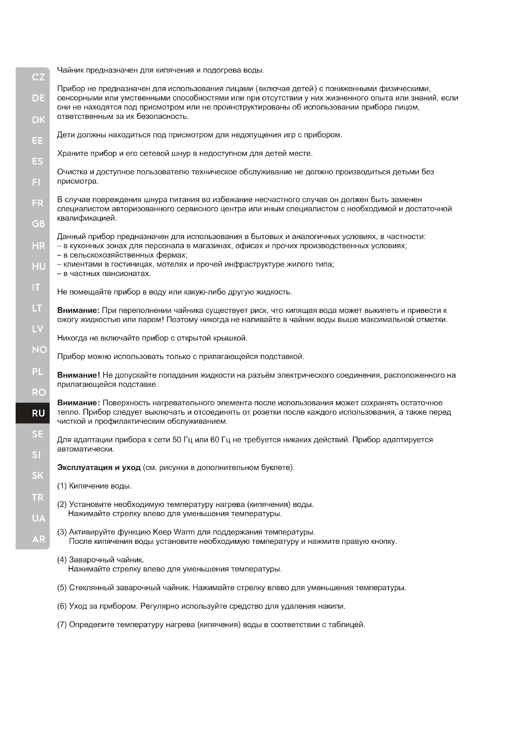В случае повреждения шнура питания во избежание несчастного случая он должен быть заменен специалистом авторизованного сервисного центра или иным специалистом с необходимой и достаточной квалификацией. Данный прибор предназначен для использования в бытовых и аналогичных условиях, в частности: – в кухонных зонах для персонала в магазинах, офисах и прочих производственных условиях; – в сельскохозяйственных фермах; – клиентами в гостиницах, мотелях и прочей инфраструктуре жилого типа; – в частных пансионатах. Не помещайте прибор в воду или какую-либо другую жидкость. Внимание: При переполнении чайника существует риск, что кипящая вода может выкипеть и привести к ожогу жидкостью или паром! Поэтому никогда не наливайте в чайник воды выше максимальной отметки. Никогда не включайте прибор с открытой крышкой. Прибор можно использовать только с прилагающейся подставкой. Внимание! Не допускайте попадания жидкости на разъём электрического соединения, расположенного на прилагающейся подставке. Внимание: Поверхность нагревательного элемента после использования может сохранять остаточное тепло. Прибор следует выключать и отсоединять от розетки после каждого использования, а также перед чисткой и профилактическим обслуживанием. Для адаптации прибора к сети 50 Гц или 60 Гц не требуется никаких действий. Прибор адаптируется автоматически. Эксплуатация и уход (см. рисунки в дополнительном буклете). (1) Кипячение воды. (2) Установите необходимую температуру нагрева (кипячения) воды. Нажимайте стрелку влево для уменьшения температуры. (3) Активируйте функцию Keep Warm для поддержания температуры. После кипячения воды установите необходимую температуру и нажмите правую кнопку. (4) Заварочный чайник. Нажимайте стрелку влево для уменьшения температуры. (5) Стеклянный заварочный чайник. Нажимайте стрелку влево для уменьшения температуры. (6) Уход за прибором. Регулярно используйте средство для удаления накипи. (7) Определите температуру нагрева (кипячения) воды в соответствии с таблицей.40 60 80 85 90 95 100