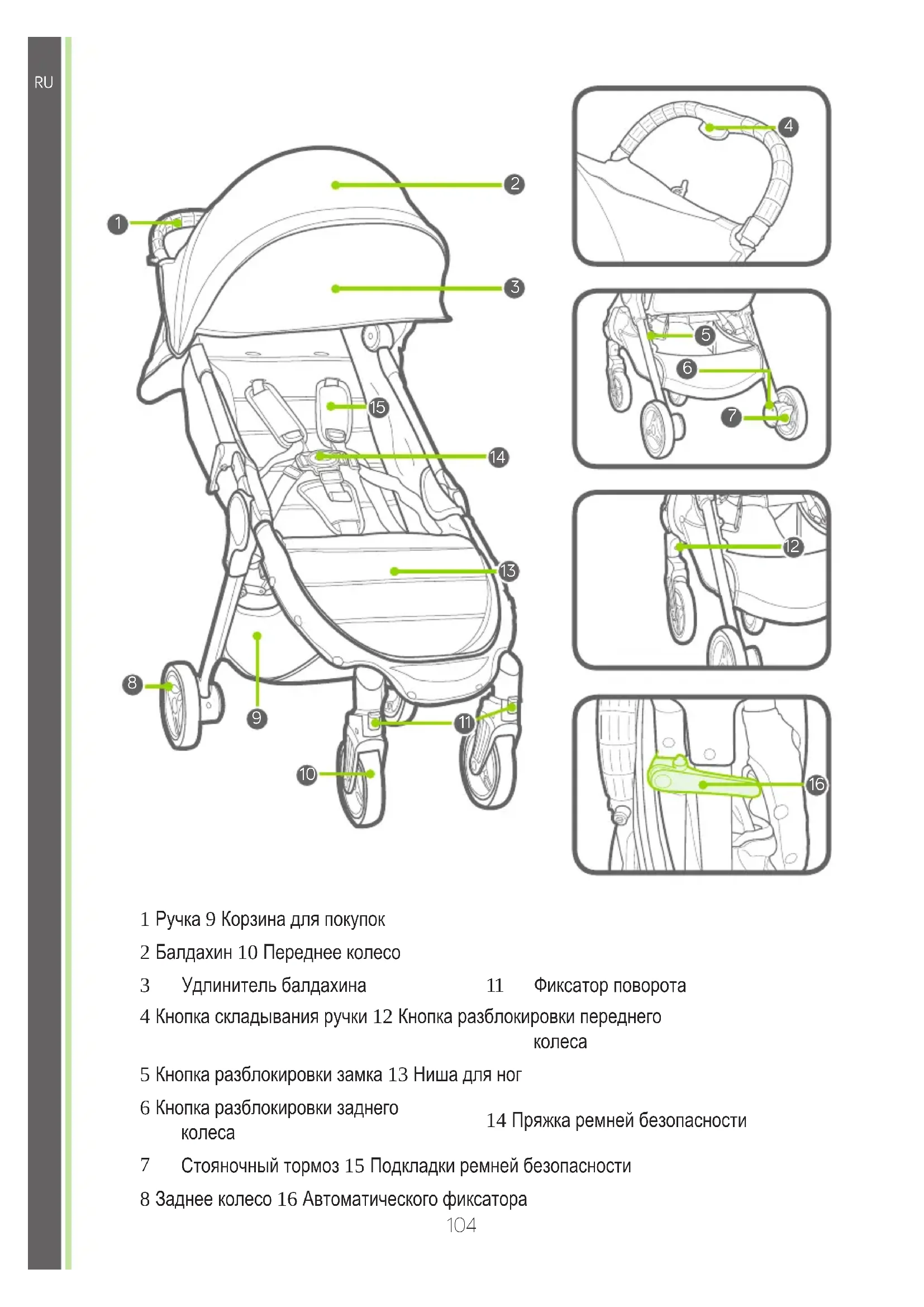 Стояночный тормоз 15 Подкладки ремней безопасности 8 Заднее колесо 16 Автоматического фиксатора