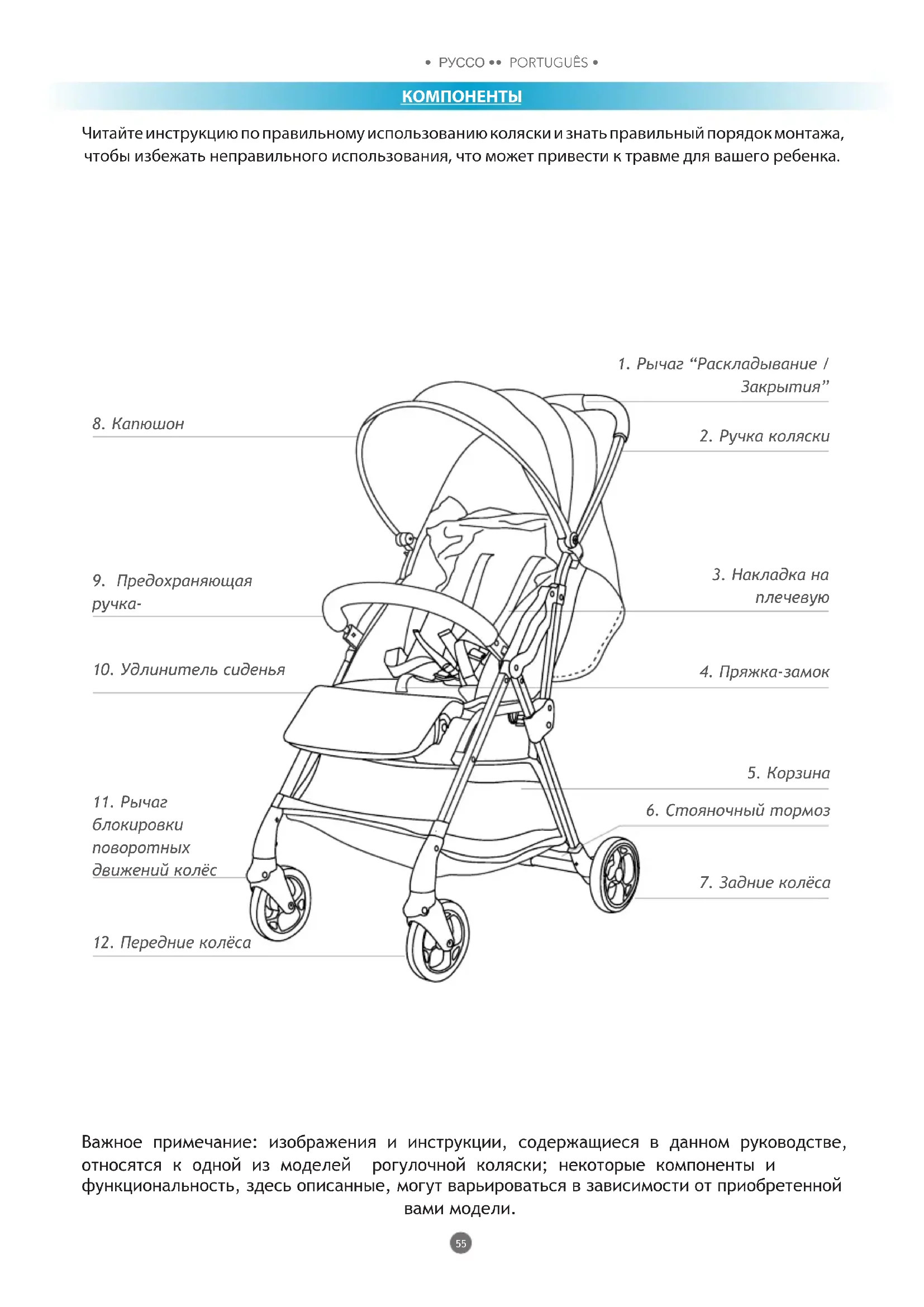 Важное примечание: изображения и инструкции, содержащиеся в данном руководстве, относятся к одной из моделей рогулочной коляски; некоторые компоненты и функциональность, здесь описанные, могут варьироваться в зависимости от приобретенной вами модели.