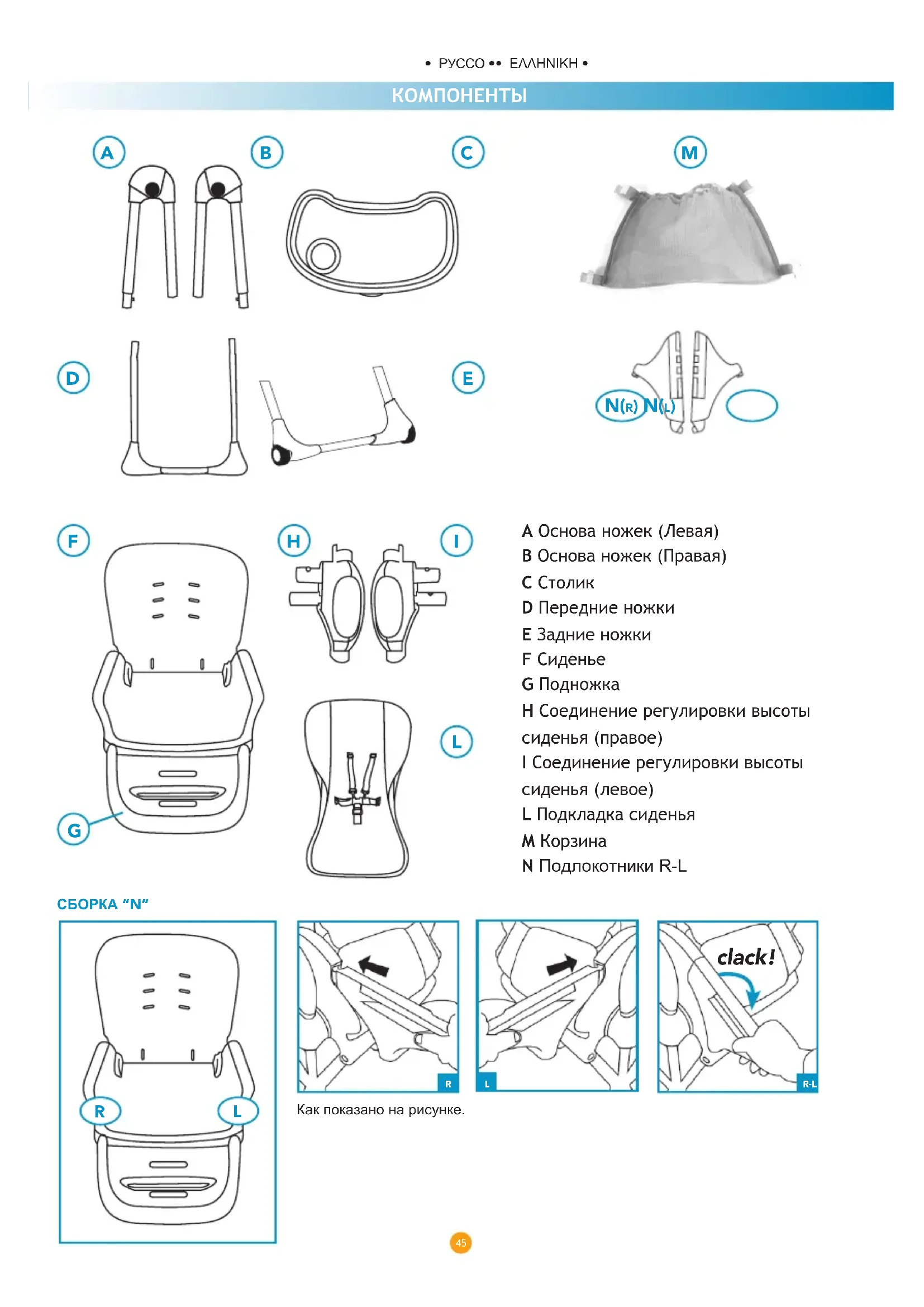 - РУССО •• ΕΛΛΗΝΙΚΗ • A Основа ножек (Левая) B Основа ножек (Правая) C Столик D Передние ножки E Задние ножки F Сиденье G Подножка H Соединение регулировки высоты сиденья (правое) I Соединение регулировки высоты сиденья (левое) L Подкладка сиденья M Корзина N Подлокотники R-L
