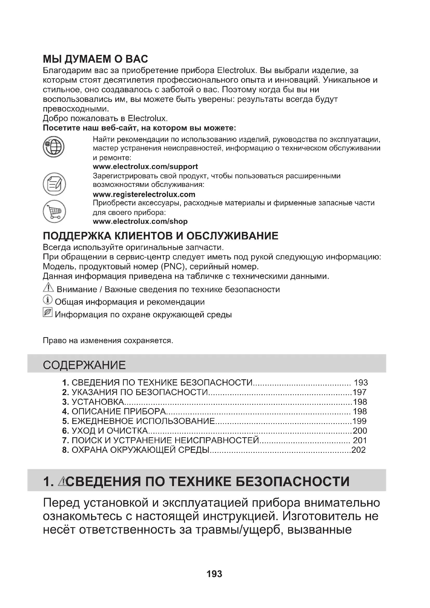 Reciclaţi materialele marcate cu simbolul . Pentru a recicla ambalajele, acestea trebuie puse în containerele corespunzătoare. Ajutaţi la protejarea mediului şi a sănătăţii umane şi la reciclarea deşeurilor din aparatele electrice şi electrocasnice. Nu aruncaţi aparatele marcate cu acest simbol împreună cu deşeurile menajere. Returnaţi produsul la centrul local de reciclare sau contactaţi administraţia oraşului dvs. 192МЫ ДУМАЕМ О ВАС Благодарим вас за приобретение прибора Electrolux. Вы выбрали изделие, закоторым стоят десятилетия профессионального опыта и инноваций. Уникальное истильное, оно создавалось с заботой о вас. Поэтому когда бы вы нивоспользовались им, вы можете быть уверены: результаты всегда будутпревосходными.Добро пожаловать в Electrolux.Посетите наш веб-сайт, на котором вы можете:Найти рекомендации по использованию изделий, руководства по эксплуатации,мастер устранения неисправностей, информацию о техническом обслуживаниии ремонте:www.electrolux.com/supportЗарегистрировать свой продукт, чтобы пользоваться расширеннымивозможностями обслуживания:www.registerelectrolux.comПриобрести аксессуары, расходные материалы и фирменные запасные частидля своего прибора:www.electrolux.com/shop ПОДДЕРЖКА КЛИЕНТОВ И ОБСЛУЖИВАНИЕ Всегда используйте оригинальные запчасти.При обращении в сервис-центр следует иметь под рукой следующую информацию:Модель, продуктовый номер (PNC), серийный номер.Данная информация приведена на табличке с техническими данными. Внимание / Важные сведения по технике безопасности Общая информация и рекомендации Информация по охране окружающей средыПраво на изменения сохраняется. 1. СВЕДЕНИЯ ПО ТЕХНИКЕ БЕЗОПАСНОСТИ......................................... 1932. УКАЗАНИЯ ПО БЕЗОПАСНОСТИ............................................................197