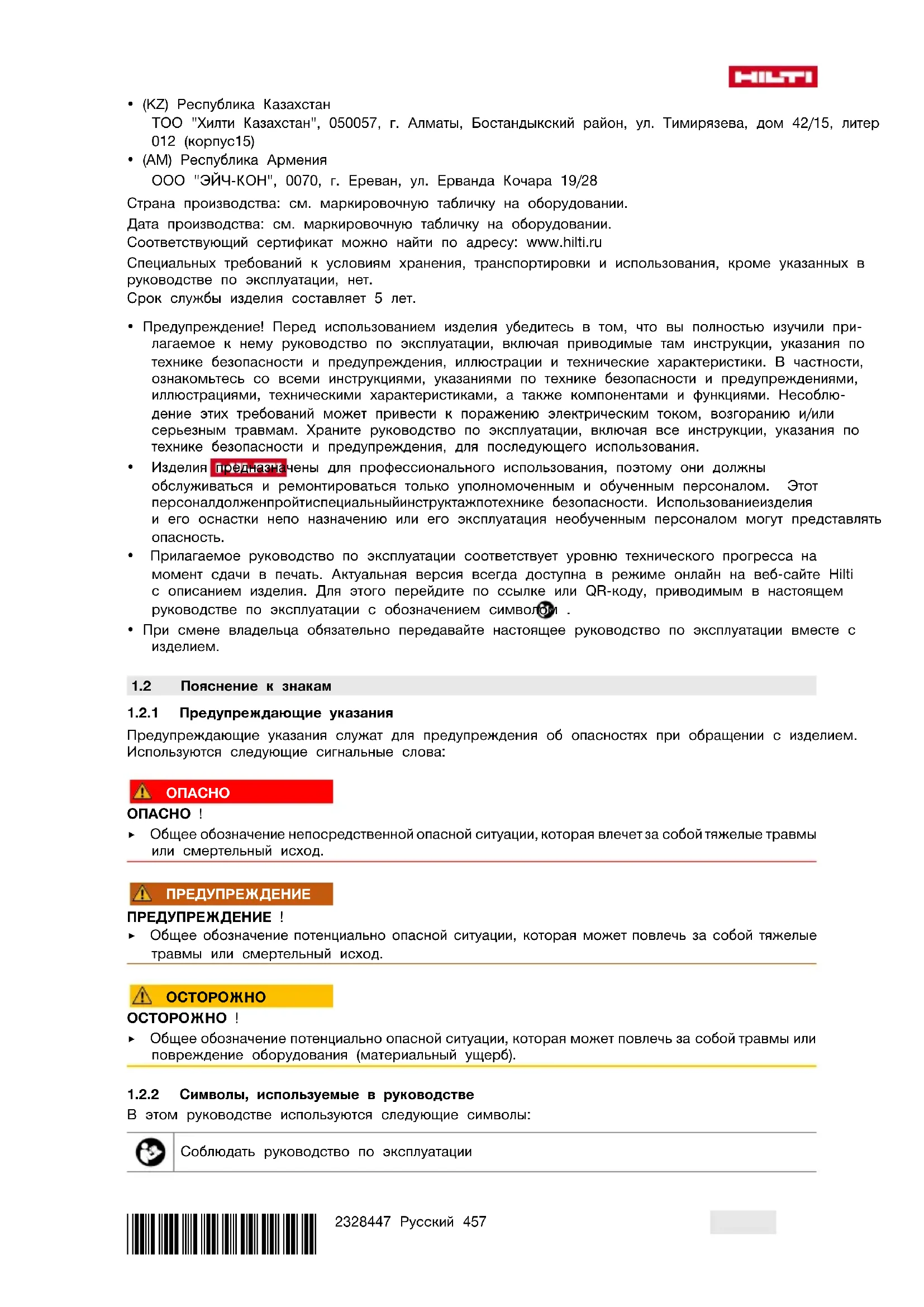 - (AM) Республика Армения ООО "ЭЙЧ-КОН", 0070, г. Ереван, ул. Ерванда Кочара 19/28 Страна производства: см. маркировочную табличку на оборудовании. Дата производства: см. маркировочную табличку на оборудовании. Соответствующий сертификат можно найти по адресу: www.hilti.ru Специальных требований к условиям хранения, транспортировки и использования, кроме указанных в руководстве по эксплуатации, нет. Срок службы изделия составляет 5 лет.