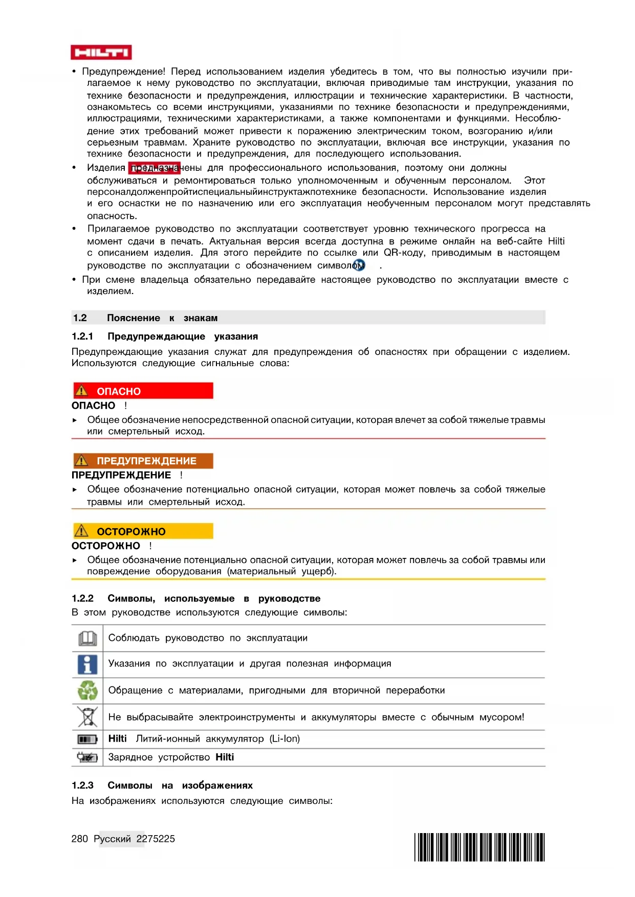 В этом руководстве используются следующие символы: Соблюдать руководство по эксплуатации Указания по эксплуатации и другая полезная информация Обращение с материалами, пригодными для вторичной переработки Не выбрасывайте электроинструменты и аккумуляторы вместе с обычным мусором! Hilti Литий-ионный аккумулятор (Li-Ion) Зарядное устройство Hilti
