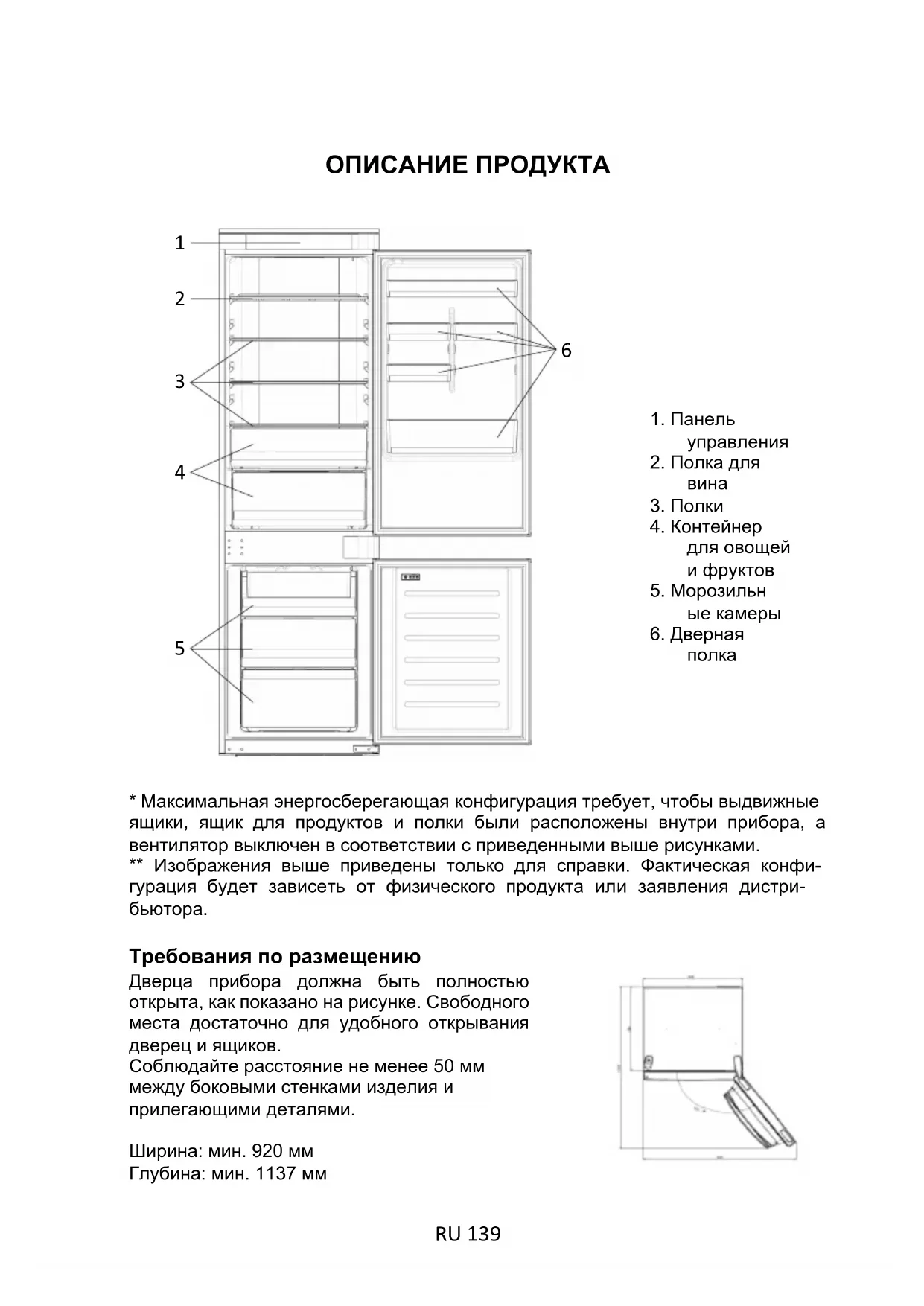 - Максимальная энергосберегающая конфигурация требует, чтобы выдвижныеящики, ящик для продуктов и полки были расположены внутри прибора, авентилятор выключен в соответствии с приведенными выше рисунками.** Изображения выше приведены только для справки. Фактическая конфи- гурация будет зависеть от физического продукта или заявления дистри- Требования по размещению Дверца прибора должна быть полностью открыта, как показано на рисунке. Свободного места достаточно для удобного открывания дверец и ящиков. Соблюдайте расстояние не менее 50 мм между боковыми стенками изделия и прилегающими деталями.Ширина: мин. 920 ммГлубина: мин. 1137 мм1. Панельуправления2. Полка для