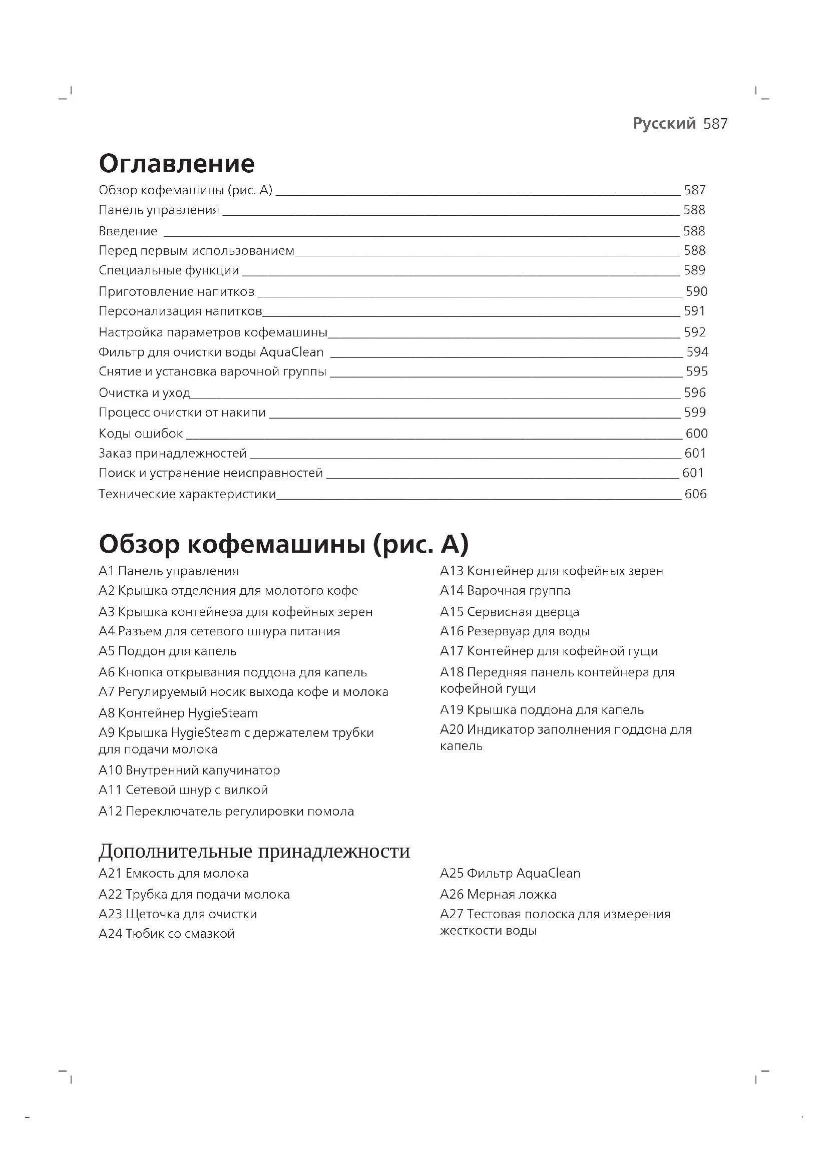Обзор кофемашины (рис. A) ______________________________________________________________ 587 Панель управления ______________________________________________________________________ 588 Введение _______________________________________________________________________________ 588 Перед первым использованием___________________________________________________________ 588 Специальные функции ___________________________________________________________________ 589 Приготовление напитков _________________________________________________________________ 590 Персонализация напитков________________________________________________________________ 591 Настройка параметров кофемашины______________________________________________________ 592 Фильтр для очистки воды AquaClean ______________________________________________________ 594 Снятие и установка варочной группы ______________________________________________________ 595 Очистка и уход___________________________________________________________________________ 596 Процесс очистки от накипи _______________________________________________________________ 599 Коды ошибок ____________________________________________________________________________ 600 Заказ принадлежностей __________________________________________________________________ 601 Поиск и устранение неисправностей ______________________________________________________ 601 Технические характеристики______________________________________________________________ 606 Обзор кофемашины (рис. A) A1 Панель управления A2 Крышка отделения для молотого кофе A3 Крышка контейнера для кофейных зерен A4 Разъем для сетевого шнура питания A5 Поддон для капель A6 Кнопка открывания поддона для капель A7 Регулируемый носик выхода кофе и молока A8 Контейнер HygieSteam A9 Крышка HygieSteam с держателем трубки для подачи молока A10 Внутренний капучинатор A11 Сетевой шнур с вилкой A12 Переключатель регулировки помола A13 Контейнер для кофейных зерен A14 Варочная группа A15 Сервисная дверца A16 Резервуар для воды A17 Контейнер для кофейной гущи A18 Передняя панель контейнера для кофейной гущи A19 Крышка поддона для капель A20 Индикатор заполнения поддона для