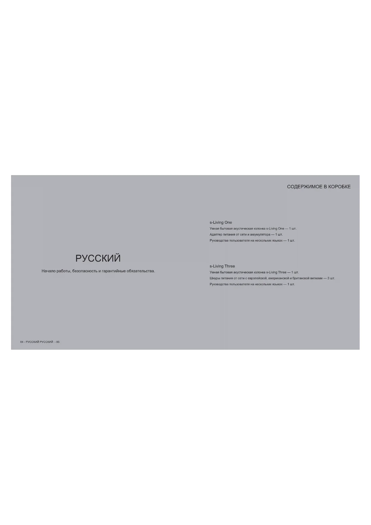 Начало работы, безопасность и гарантийные обязательства. s-Living One s-Living Three Умная бытовая акустическая колонка s-Living One — 1 шт. Адаптер питания от сети и аккумулятора — 1 шт. Руководства пользователя на нескольких языках — 1 шт. Умная бытовая акустическая колонка s-Living Three — 1 шт. Шнуры питания от сети с европейской, американской и британской вилками — 3 шт. Руководства пользователя на нескольких языках — 1 шт. СОДЕРЖИМОЕ В КОРОБКЕ86 - РУССКИЙ РУССКИЙ - 87 ВКЛЮЧИТЕ СВОЮ КОЛОНКУ s-LIVING ВКЛЮЧИТЕ СВОЮ КОЛОНКУ s-LIVING