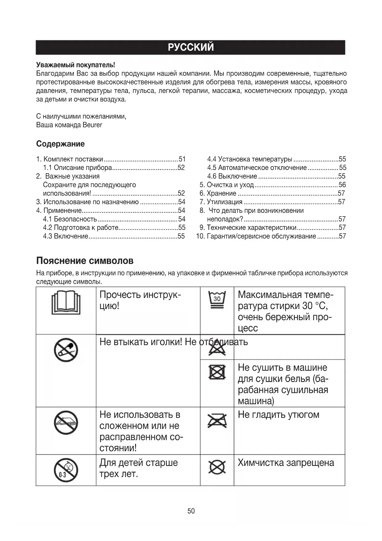 Химчистка запрещена Уважаемый покупатель! Благодарим Вас завыбор продукции нашей компании. Мы производим современные, тщательно протестированные высококачественные изделия для обогрева тела, измерения массы, кровяного давления, температуры тела, пульса, легкой терапии, массажа, косметических процедур, ухода задетьми иочистки воздуха. Снаилучшими пожеланиями, Ваша команда Beurer51