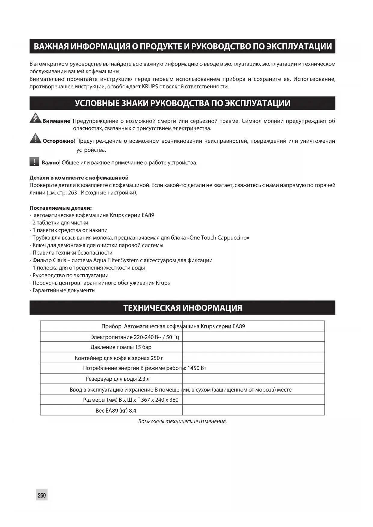 Важно! Общее или важное примечание о работе устройства. Детали в комплекте с кофемашиной Проверьте детали в комплекте с кофемашиной. Если какой-то детали не хватает, свяжитесь с нами напрямую по горячей линии (см. стр. 263 : Исходные настройки). Поставляемые детали: - автоматическая кофемашина Krups серии EA89 - 2 таблетки для чистки - 1 пакетик средства от накипи - Трубка для всасывания молока, предназначаемая для блока «One Touch Cappuccino» - Ключ для демонтажа для очистки паровой системы - Правила техники безопасности - Фильтр Claris – система Aqua Filter System с аксессуаром для фиксации - 1 полоска для определения жесткости воды - Руководство по эксплуатации - Перечень центров гарантийного обслуживания Krups - Гарантийные документы ТЕХНИЧЕСКАЯ ИНФОРМАЦИЯ Прибор Автоматическая кофемашина Krups серии EA89 Электропитание 220-240 В~ / 50 Гц Давление помпы 15 бар Контейнер для кофе в зернах 250 г Потребление энергии В режиме работы: 1450 Вт Резервуар для воды 2.3 л Ввод в эксплуатацию и хранение В помещении, в сухом (защищенном от мороза) месте Размеры (мм) В x Ш x Г 367 x 240 x 380 Вес EA89 (кг) 8.4 Возможны технические изменения.261