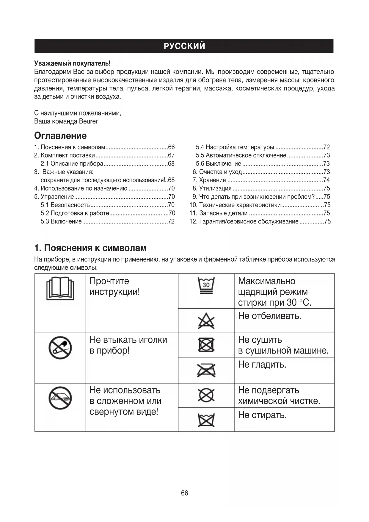 Уважаемый покупатель! Благодарим Вас завыбор продукции нашей компании. Мы производим современные, тщательно протестированные высококачественные изделия для обогрева тела, измерения массы, кровяного давления, температуры тела, пульса, легкой терапии, массажа, косметических процедур, ухода задетьми иочистки воздуха. Снаилучшими пожеланиями, Ваша команда Beurer67 Запрещается использовать для маленьких детей (до 3лет).