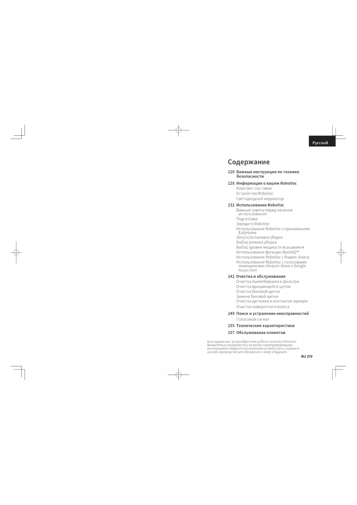 220Важныеинструкциипотехнике безопасности 228ИнформацияовашемRoboVac Комплектпоставки УстройствоRoboVac Светодиодныйиндикатор 232ИспользованиеRoboVac Важныесоветыпередначалом использования