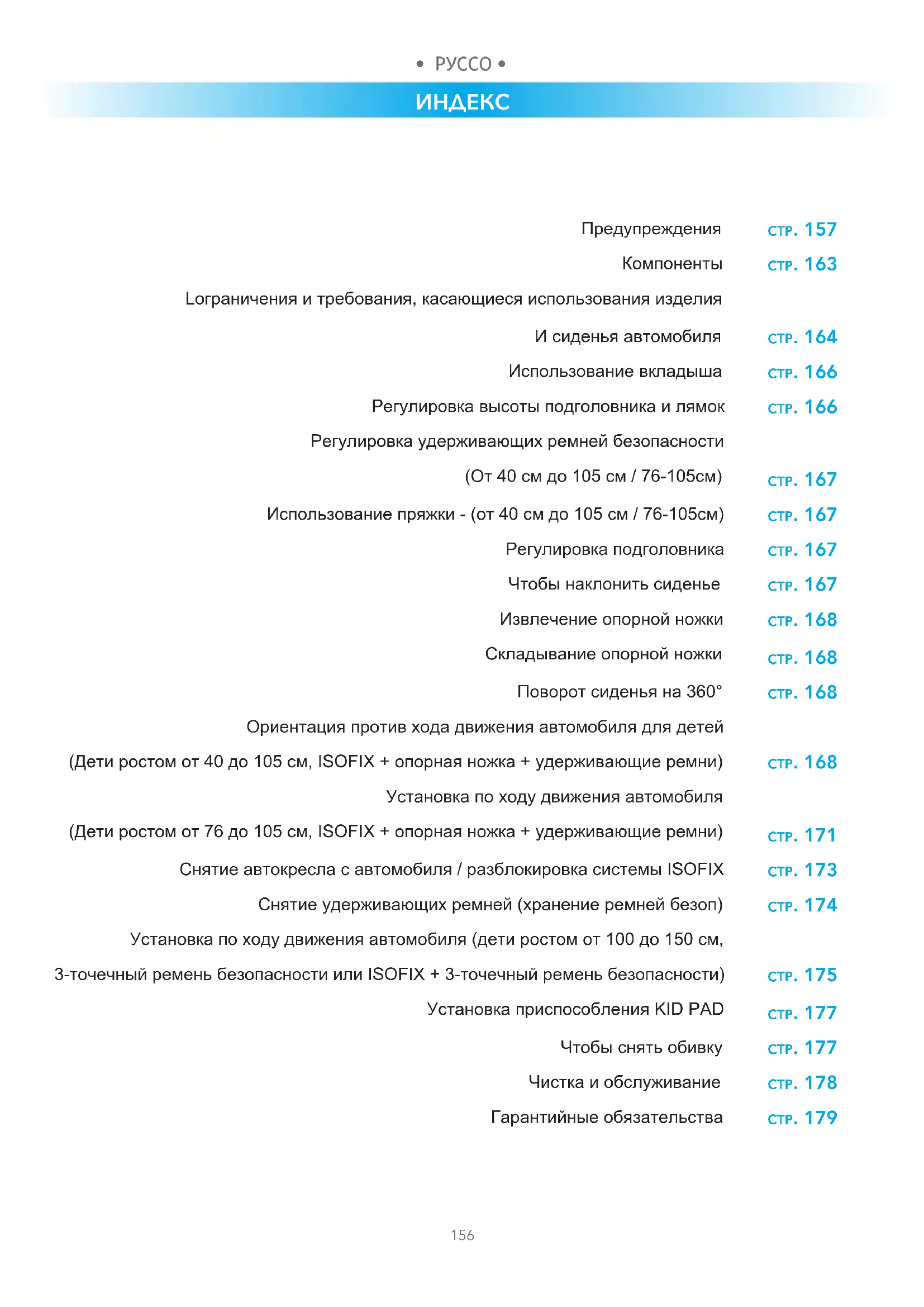 Lограничения и требования, касающиеся использования изделия И сиденья автомобиля Использование вкладыша Регулировка высоты подголовника и лямок Регулировка удерживающих ремней безопасности (От 40 см до 105 см / 76-105см) Использование пряжки - (от 40 см до 105 см / 76-105см) Регулировка подголовника Чтобы наклонить сиденье Извлечение опорной ножки Складывание опорной ножки Поворот сиденья на 360° Ориентация против хода движения автомобиля для детей (Дети ростом от 40 до 105 см, ISOFIX + опорная ножка + удерживающие ремни) Установка по ходу движения автомобиля (Дети ростом от 76 до 105 см, ISOFIX + опорная ножка + удерживающие ремни) Снятие автокресла с автомобиля / разблокировка системы ISOFIX Снятие удерживающих ремней (хранение ремней безоп) Установка по ходу движения автомобиля (дети ростом от 100 до 150 см, 3-точечный ремень безопасности или ISOFIX + 3-точечный ремень безопасности) Установка приспособления KID PAD Чтобы снять обивку Чистка и обслуживание Гарантийные обязательства• РУССО •
