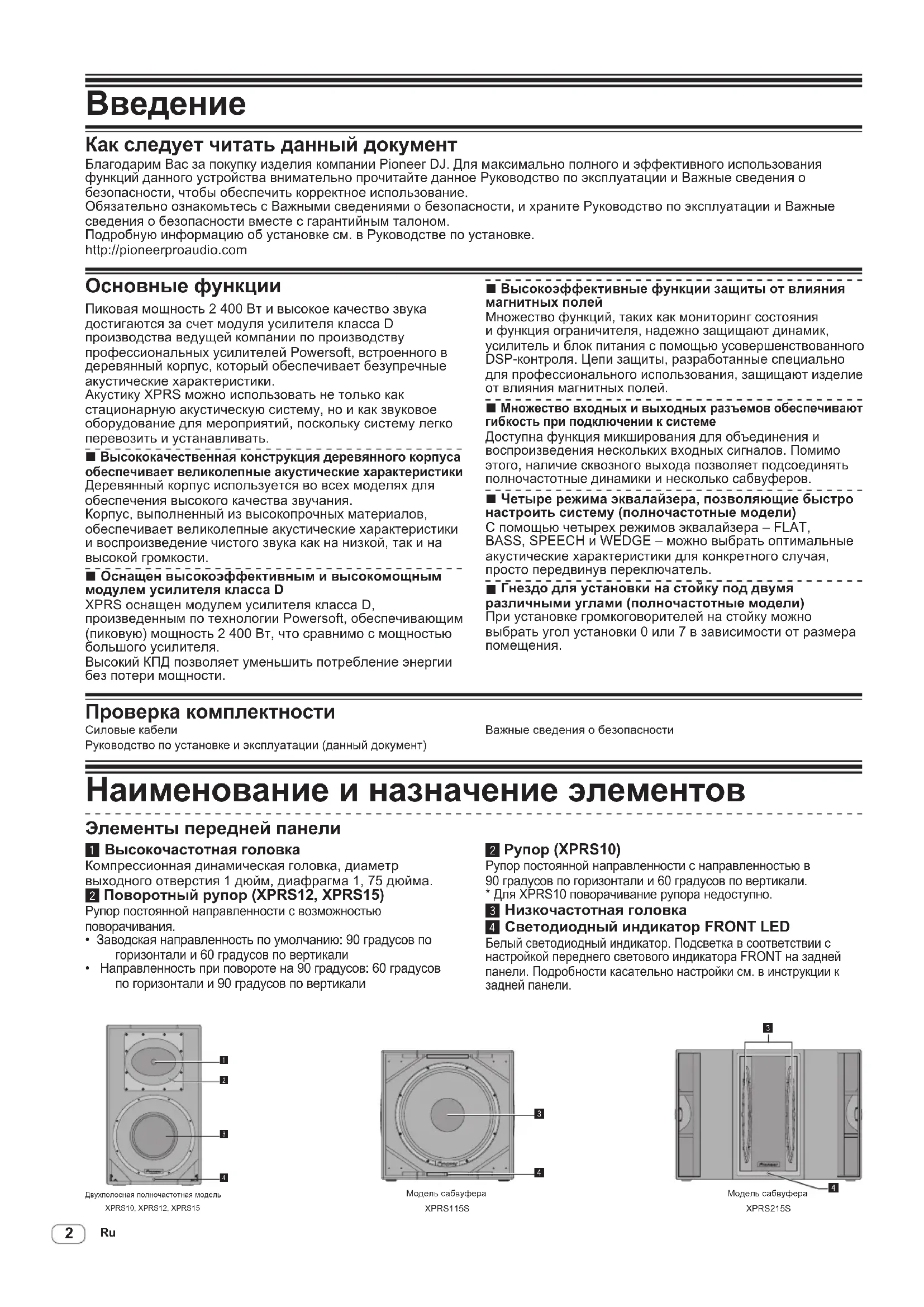 Как следует читать данный документ Благодарим Вас за покупку изделия компании Pioneer DJ. Для максимально полного и эффективного использования функций данного устройства внимательно прочитайте данное Руководство по эксплуатации и Важные сведения о безопасности, чтобы обеспечить корректное использование. Обязательно ознакомьтесь с Важными сведениями о безопасности, и храните Руководство по эксплуатации и Важные сведения о безопасности вместе с гарантийным талоном. Подробную информацию об установке см. в Руководстве по установке. http://pioneerproaudio.com Пиковая мощность 2 400 Вт и высокое качество звука достигаются за счет модуля усилителя класса D производства ведущей компании по производству профессиональных усилителей Powersoft, встроенного в деревянный корпус, который обеспечивает безупречные акустические характеристики. Акустику XPRS можно использовать не только как стационарную акустическую систему, но и как звуковое оборудование для мероприятий, поскольку систему легко перевозить и устанавливать.
