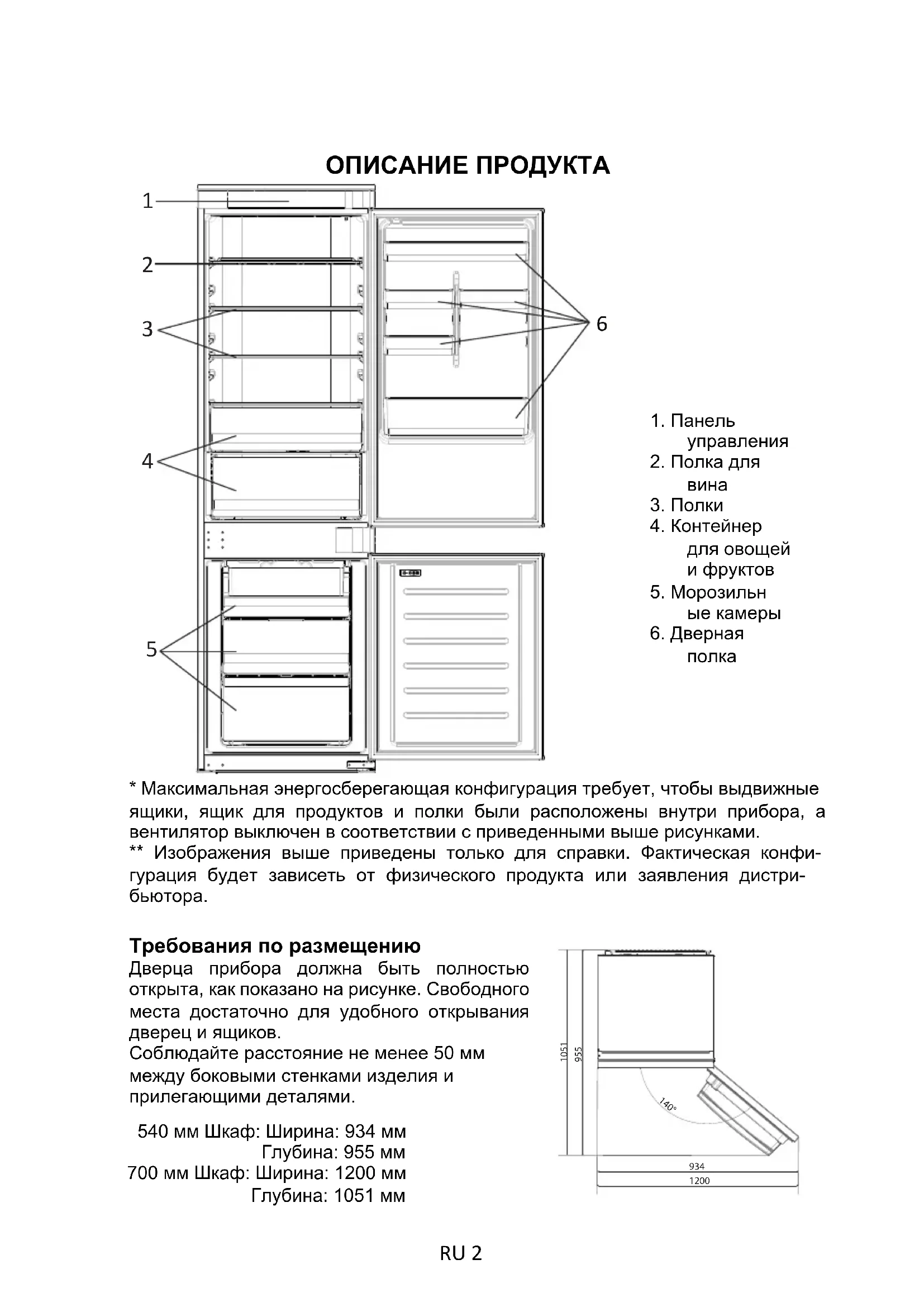 3. Полки4. Контейнердля овощейи фруктов5. Морозильные камеры6. Двернаяполка* Максимальная энергосберегающая конфигурация требует, чтобы выдвижныеящики, ящик для продуктов и полки были расположены внутри прибора, авентилятор выключен в соответствии с приведенными выше рисунками.** Изображения выше приведены только для справки. Фактическая конфи- гурация будет зависеть от физического продукта или заявления дистри- бьютора.Требования по размещению Дверца прибора должна быть полностью открыта, как показано на рисунке. Свободного места достаточно для удобного открывания дверец и ящиков. Соблюдайте расстояние не менее 50 мм между боковыми стенками изделия и прилегающими деталями.540 мм Шкаф: Ширина: 934 ммГлубина: 955 мм700 мм Шкаф: Ширина: 1200 ммГлубина: 1051 мм