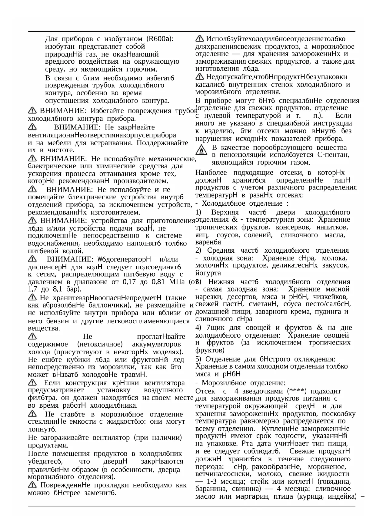 Лампа,используемаяв приборе, специально предназначена для электробытовых приборов и непригодна для освещения помещений (Регламент Комиссии ЕС № 244/2009). Прибор предназначен для использования в помещениях, температура воздуха в которых соответствует указанным ниже диапазонам (в соответствии с климатическим классом, указанным на табличке с паспортными данными). Прибор может не работать надлежащим образом, если он длительное время находился при температуре, выходящей за пределы допустимого интервала. Климатический класс температуры окружающей среды: SN: Вид 10 °C до 32 °C; N: Вид 16 °C до 32 °C; ST: Вид 16 °C до 38 °C ; T: Вид 16 °C до 43 °C Прибор не содержит хлорфторуглероды (CFC). В холодильном контуре используется хладагент R600a (HC).Для приборов с изобутаном (R600a): изобутан представляет собой природный газ, не оказывающий вредного воздействия на окружающую среду, но являющийся горючим. В связи с этим необходимо избегать повреждения трубок холодильного контура, особенно во время опустошения холодильного контура. ВНИМАНИЕ: Избегайте повреждения трубок холодильного контура прибора. ВНИМАНИЕ: Не закрывайте вентиляционныеотверстиянакорпусеприбора и на мебели для встраивания. Поддерживайте их в чистоте. ВНИМАНИЕ: Не используйте механические, электрические или химические средства для ускорения процесса оттаивания кроме тех, которые рекомендованы производителем. ВНИМАНИЕ: Не используйте и не помещайте электрические устройства внутрь отделений прибора, за исключением устройств, рекомендованных изготовителем. ВНИМАНИЕ: устройства для приготовления льда и/или устройства подачи воды, не подключенные непосредственно к системе водоснабжения, необходимо наполнять только питьевой водой. ВНИМАНИЕ: Льдогенераторы и/или диспенсеры для воды следует подсоединять к сетям, распределяющим питьевую воду с давлением в диапазоне от 0,17 до 0,81 МПа (от 1,7 до 8,1 бар). Не хранитевзрывоопасныепредметы (такие как аэрозольные баллончики), не размещайте и не используйте внутри прибора или вблизи от него бензин и другие легковоспламеняющиеся