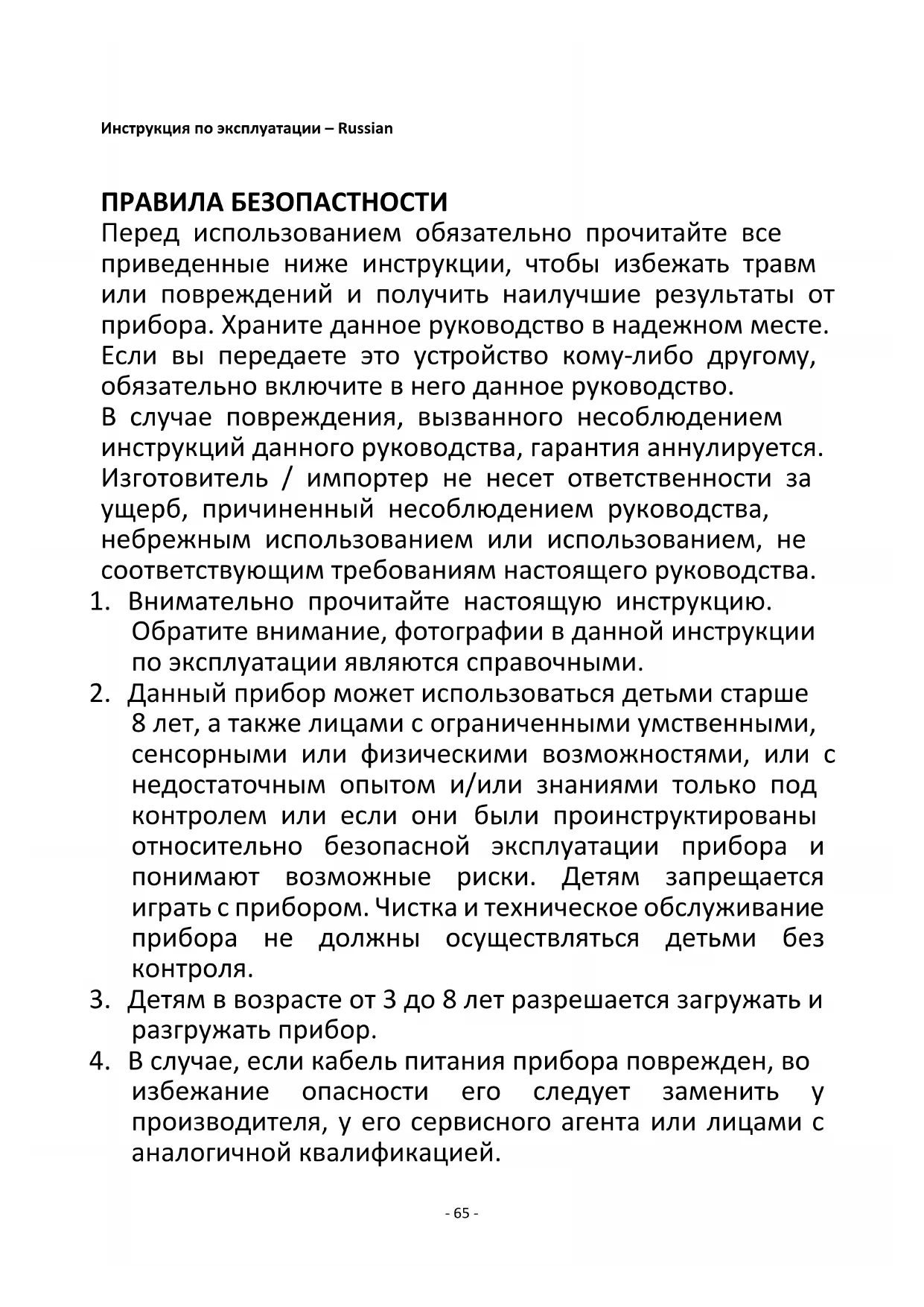 Emerio B.V. Zomervaart 1A 2033 DA Haarlem The Netherlands Dział obsługi klienta: T: +31(0)23 3034369 E: info.nl@emerio.eu- 65 - Инструкция по эксплуатации – Russian ПРАВИЛА БЕЗОПАСТНОСТИ Перед использованием обязательно прочитайте все приведенные ниже инструкции, чтобы избежать травм или повреждений и получить наилучшие результаты от прибора. Храните данное руководство в надежном месте. Если вы передаете это устройство кому-либо другому, обязательно включите в него данное руководство. В случае повреждения, вызванного несоблюдением инструкций данного руководства, гарантия аннулируется. Изготовитель / импортер не несет ответственности за ущерб, причиненный несоблюдением руководства, небрежным использованием или использованием, не соответствующим требованиям настоящего руководства.